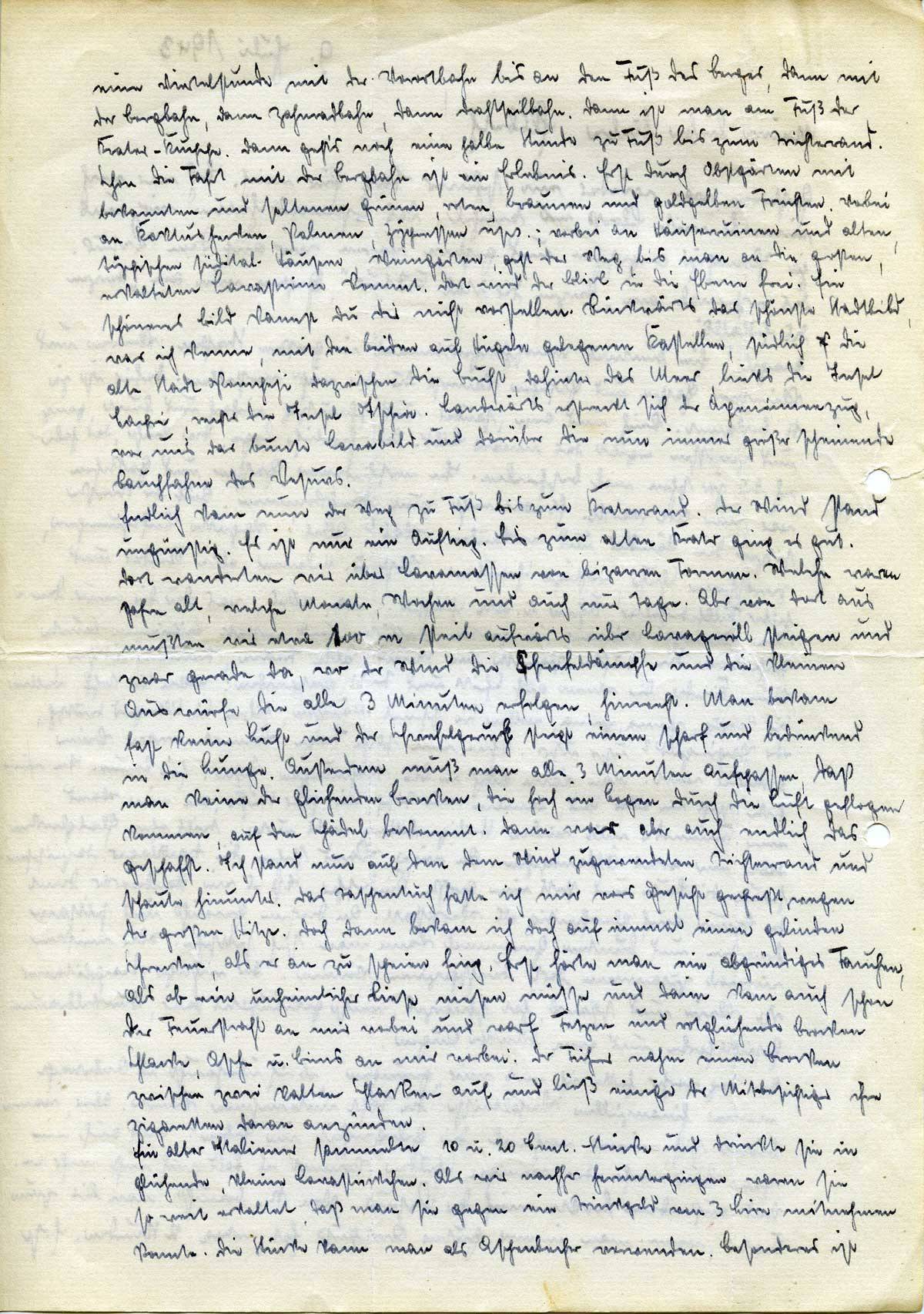 Neapel! Ein bunteres Menschengewimmel in großen Straßen, kleinen und kleinsten Gassen und Gäßchen kannst Du Dir nicht vorstellen. Dafür ist ja N. bekannt. Reich und arm, sauber und schmutzig, einfach und bunt, ganz und zerrissen ergibt das innere Bild. Die herrliche Lage, die Luft, das habe ich Dir ja schon mal beschrieben. In verschiedenen Gassen und Gäßchen war eine Art Markt. Es war nicht zum Durchkommen. Auf der Straße sitzen die Händler und verkaufen. Was? Alles! Kaputte Luftpumpen, zerrissene Schuhe, rostige Schrauben, Obst u. Melonen, alte Kleider und halbe Füllfederhalter, Uhren u. alte Schlüssel . . na, alles, was Du Dir nur denken kannst. Männer in großen Strohhüten und anstatt Leibriemen bunte Tücher um die Hüfte, Zigarette im Mund, alte Frauen, Freudenmädchen, kleine Kinder, die einen auf Schritt und Tritt ansprechen: Wollen Sie Stoff, wollen Sie Anzug, prima, prima, wollen Sie schönes Mädchen, haben Sie Silbergeld deutsch, oder Papiergeld? usw. usw. Ohne eine solche Frage kommt man keine 3 Meter weit. Man kann auch in die Wohnungen sehen. Ein Raum. In einer Ecke steht ein alter Herd, daneben ein Tisch, ein paar Stühle, an einer Wand eine Kommode mit vielen Heiligenbildern teils unter, teils ohne Glasglocken, dabei ein rotes Öllämpchen. An einer Wand stehen die Nachtlager. Dazwischen herum die Leute und stets eine große Kinderschar. Ist es ein Handwerker, dient der Raum auch gleichzeitig als Werkstatt. An diesem Gewühl und seltsam fremden und bunten Gewimmel kann man sich sattsehen. Wir müßten einmal zusammen dort durchspazieren können. Der richtige Neapolitaner ist klein und schlank, hat schwarzes, meist gekräuseltes Haar, dunkelbraune Gesichtsfarbe und ganz dunkle Augen.