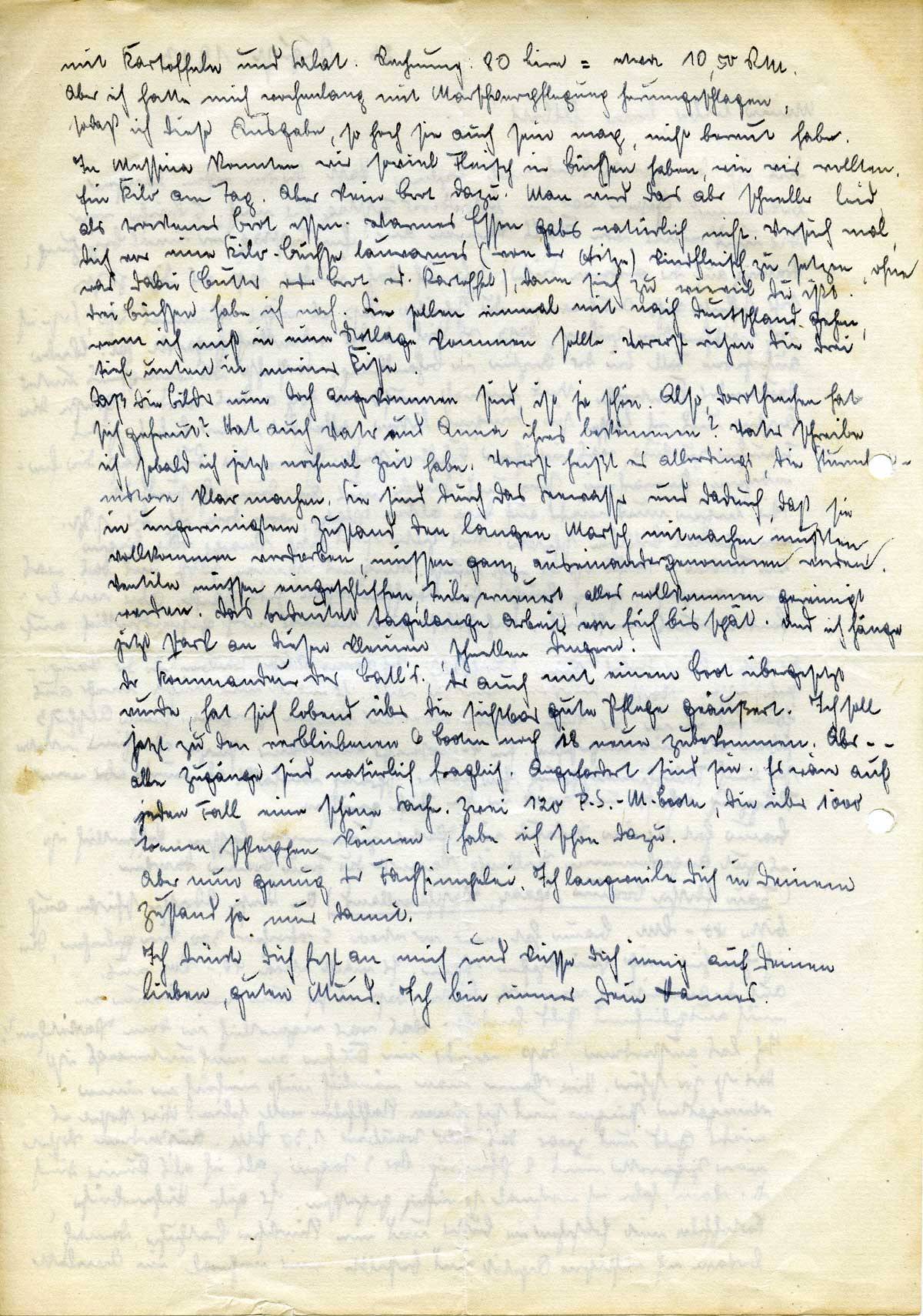 Braun hat Dir im Urlaub ein Paket zukommen lassen. Hoffentlich ist es gut angekommen. Vielleicht kannst Du Frau Braun danken. (Frau Editha Braun, Spaaz, Westhavelland). An diese Adresse schicke auch bitte 40,- RM. Braun hat mir vor etwa 5 Wochen 300 Lire geliehen, die ich ihm hier nicht zurückzahlen kann. Es macht etwa 40,- RM aus. Auf der Anweisung vermerke bitte, daß es sich um von Braun an mich ausgeliehenes Geld handelt. Was war eigentlich in dem Paketchen? Ich las außerdem, daß wieder ein Kuchen an mich unterwegs ist. Das ist ja schön. Hier kann man nämlich nicht einfach in einen Weingarten steigen und sich einen Stahlhelm voll holen. Hier kostet es wieder Geld und zwar das Kilo Trauben 1,30 RM. Außerdem kostet eine Zigarette rund 8 Pfennig. Vor 3 Tagen, als ich als Kurier durch N. kam, habe ich nochmal so richtig gegessen. Es gab Hühnerbrühe, Kartoffeln mit Erbschen in Butter und ein Stückchen Brathuhn. Darnach bekam ich richtigen Apetit und bestellte mir nochmal ein Omelett