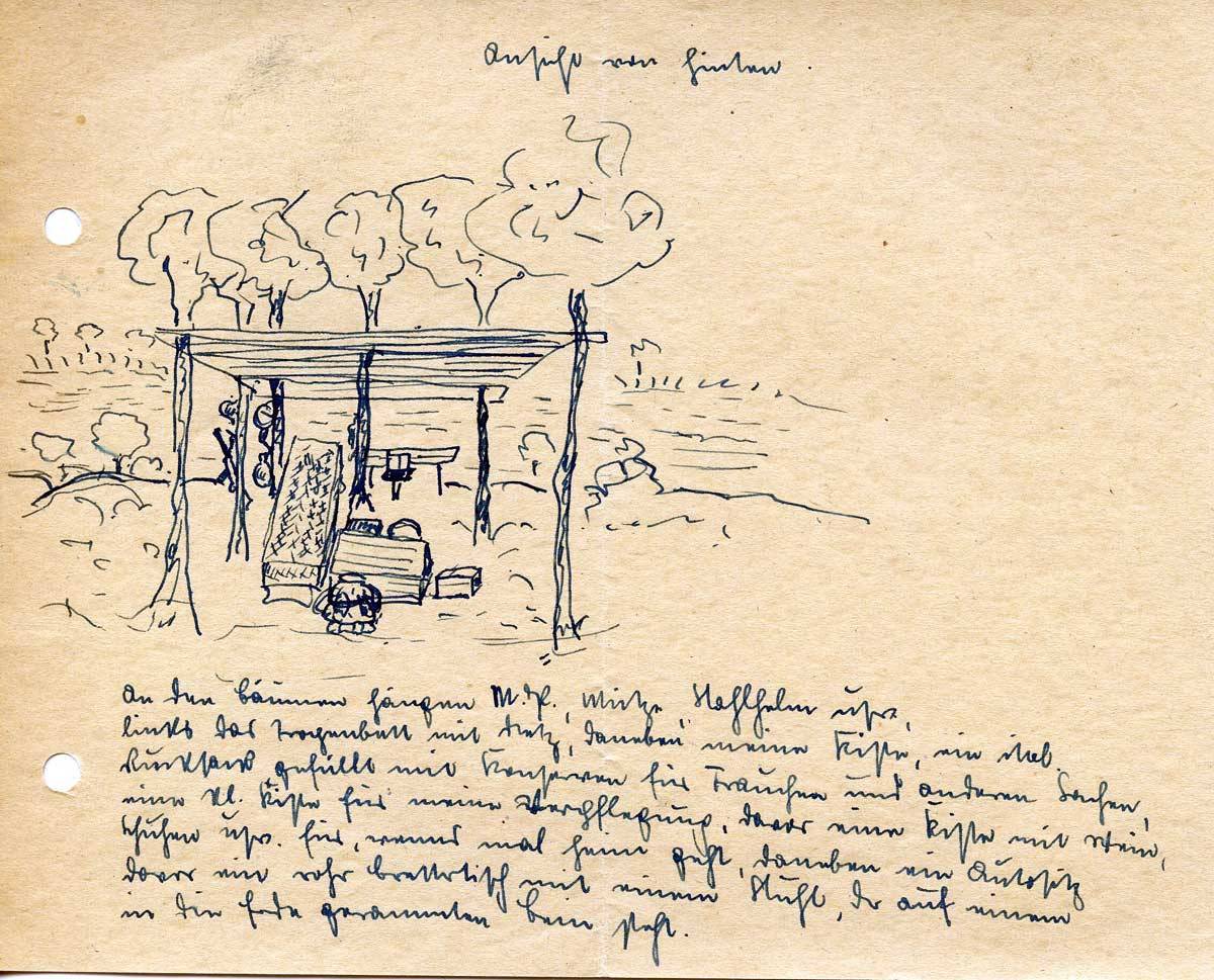 Wir liegen nun wieder auf dem alten Platz, von dem ich Dir s.Zt. ein kleines Bildchen schickte. Nur Zelte sind jetzt knapp. Wir liegen im Freien. Nachts ist es recht feucht. Morgens ist man selbst und das was man anzieht, ganz feucht. Die Waffen rosten jede Nacht. Aber wir befinden uns wohlauf. Ich selbst bin immer noch gesundheitlich auf der Höhe. Kein Fieber, kein Durchfall. Ich kann Obst (Trauben in der Hauptsache) essen, Wasser trinken, wie ich will. Es macht mir nichts mehr aus. Eben hat es in der Nähe wieder ordentlich Bomben geregnet. Einen Abschuß haben wir mit angesehen. Ein 4-motoriger Amerikaner stürzte ab. Einer rettete sich durch Fallschirmabsprung. Ein anderer sprang ebenfalls ab, wurde aber vom Flugzeug erfaßt und mit in die Tiefe gerissen.