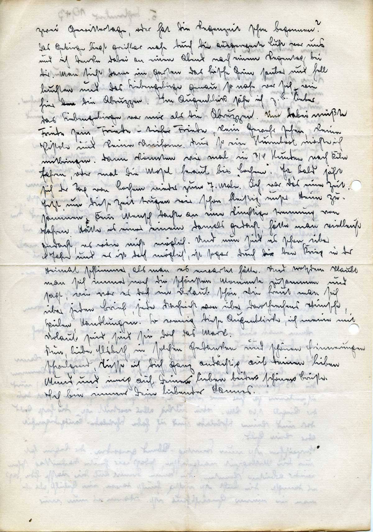 Nur so ein Sturmboot möchte ich mitbringen. Dann könnten wir mal in ¾ Stunden nach Köln fahren, oder mal die Mosel herauf bis „Cochem“. Ja, bald jährt sich der Tag von Cochem wieder zum 7. Male. Ach, war das eine Zeit. Jetzt, um diese Zeit trugen wir schon fleißig unser Heim zusammen. Kein Mensch dachte an eine künftige Trennung von Jahren. Hätte es einer einem damals gedacht [er meinte: gesagt], hätte man vielleicht gedacht, es wäre nicht möglich. Und nun sind es schon über 4 Jahre und es ist doch möglich, ist sogar durch die den Krieg in der Heimat schlimmer, als man es erwartet hätte. Und trotzdem klaubt man sich immer noch die schönsten Momente zusammen und sagt, wie war es doch im Urlaub schön, wie freut man sich über jeden Brief, jede Nachricht über Dorotheechens Wünsche, Spielen, Handlungen. So wenig diese Augenblicke, ich meine mit Urlaub, sind, sind sie doch das Mark.