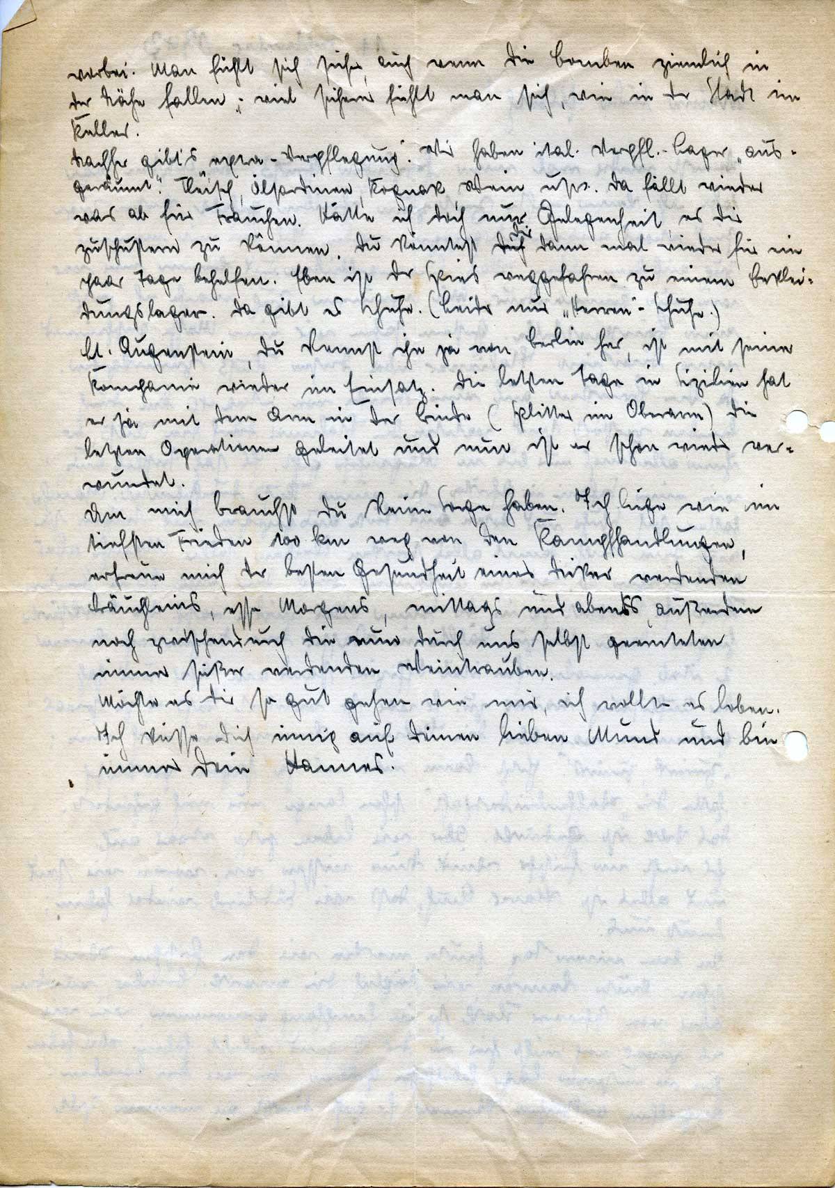 Um mich brauchst Du keine Sorge zu haben. Ich liege wie im tiefsten Frieden 100 km weg von den Kampfhandlungen, erfreue mich der besten Gesundheit eines dicker werdenden Bäuchleins, esse morgens, mittags und abends, außerdem noch zwischendurch die nun durch uns selbst geernteten immer süßer werdenden Weintrauben.