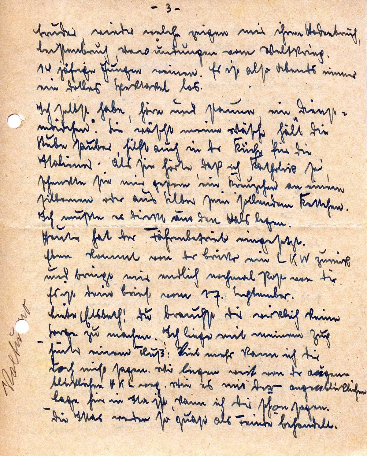 Heute hat der Fährenbetrieb eingesetzt. Eben kommt von der Brüko ein LKW zurück und bringt mir endlich noch mal Post von Dir. Es ist Dein Brief vom 17. September.
