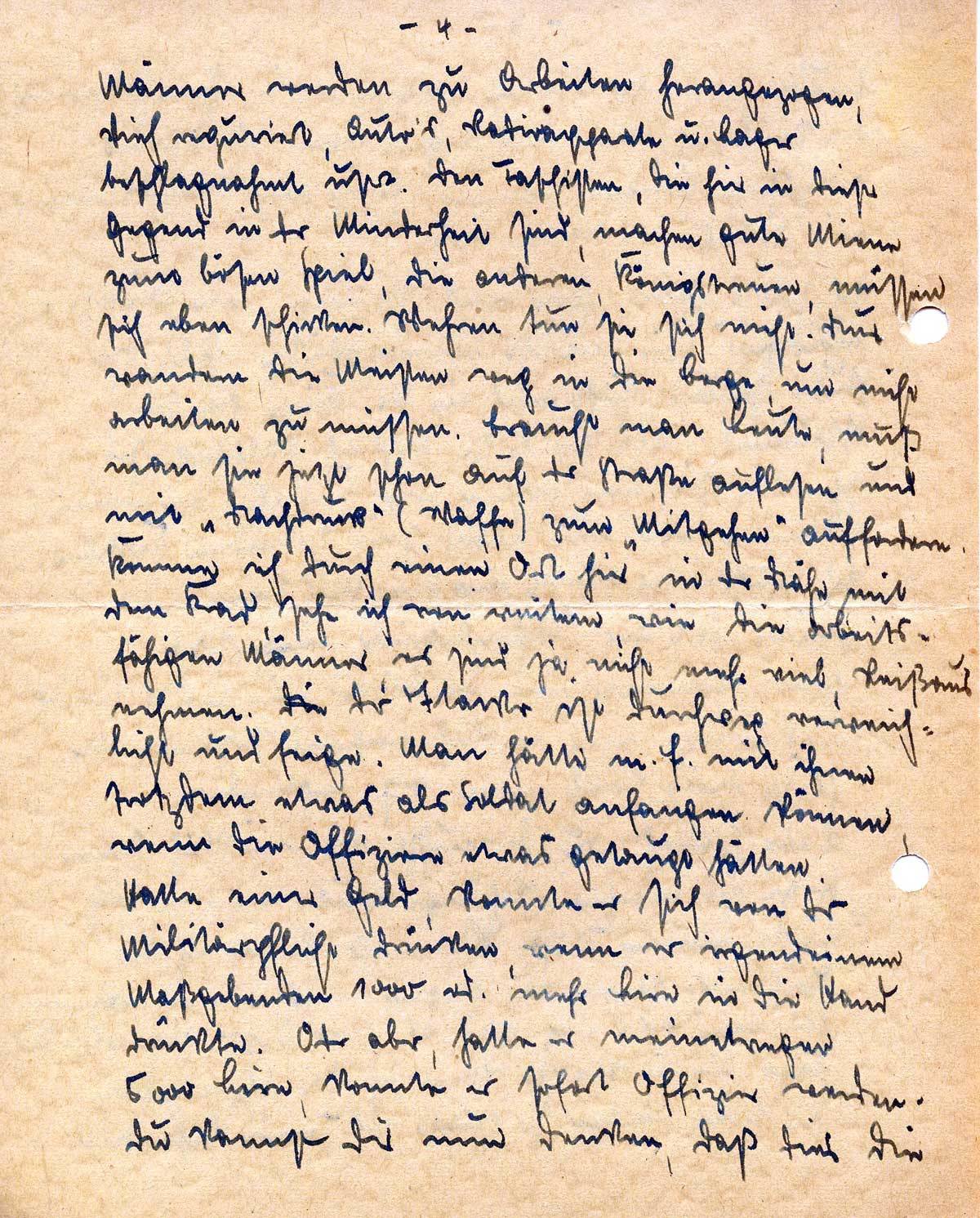 Übrigens, bei der Razzia haben wir einen nur erwischt, der uns stiften gegangen war. Wir haben Ich habe ihn des morgens erschießen lassen. Damit keine Arbeit mit dem Grabschaufeln war, haben wir ihn in den seichten Fluß gestellt. Als er sah, daß es Ernst wurde, tauchte er unter. Aber er mußte ja doch den Kopf zum Luftschöpfen herausstecken und dann wars um ihn geschehen. Er trieb dann den Fluß hinunter. Die Anderen arbeiten jetzt flotter. Abends ist man bin ich dauernd belagert. Jeder möchte dann mal bis zum anderen Morgen Urlaub haben. „Mio Casa, mio Casa Signore Marschallo“! So schwirrt es um einen her. Dann suche ich 3 oder 4 aus, die für einen Abend und die Nacht nach Hause dürfen. Zu diesen Glücklichen zu zählen ist nun das Bestreben jedes Einzelnen. Sie kommen nun mit den besten Gründen. „Signore Marschallo, mia donna malatto, set Bambino“ usw. (Herr Feldwebel, meine Frau krank, 7 Kinder“, der andere hat einen blinden