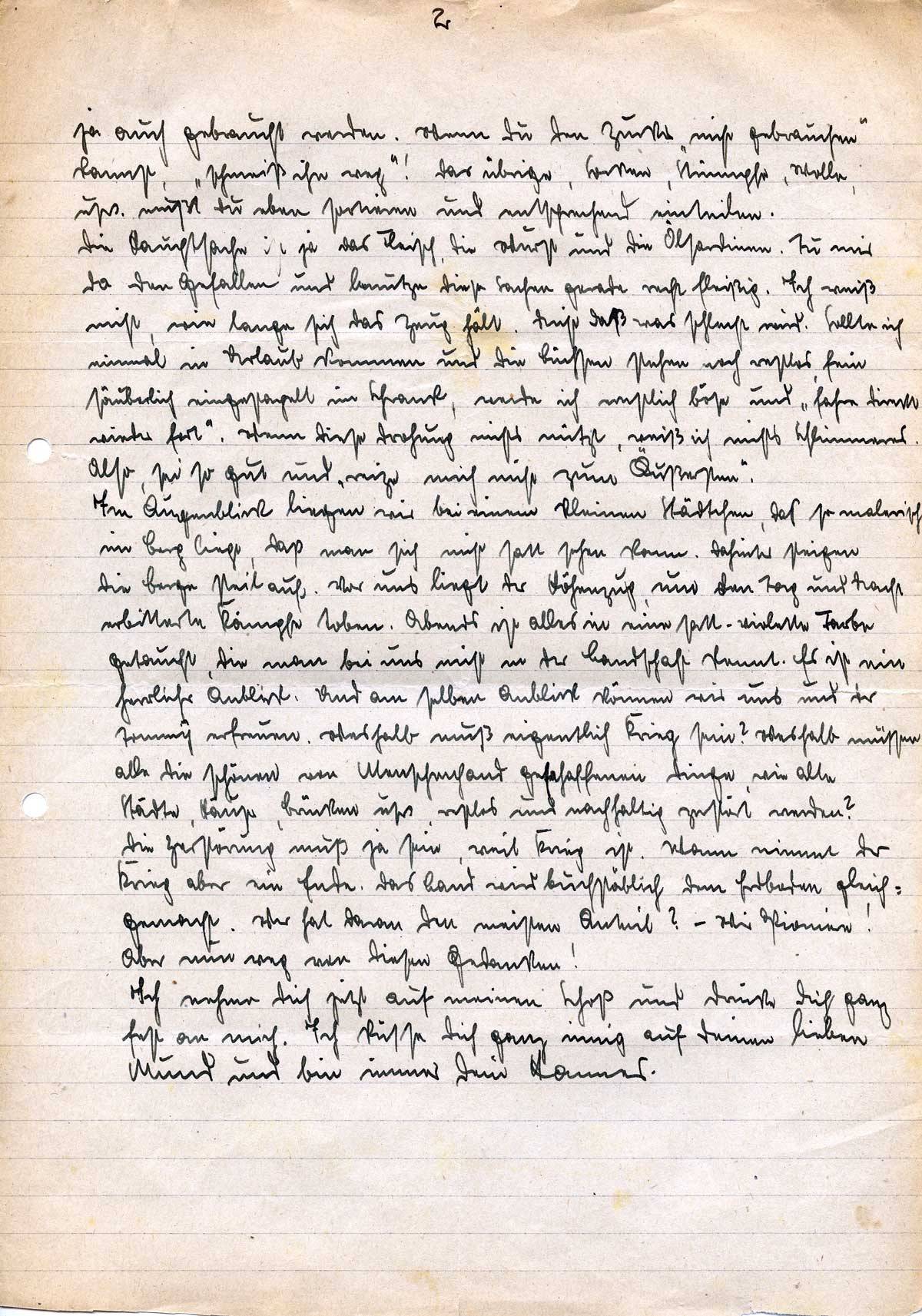 wahrscheinlich morgen zu erwarten ist. Dann geht’s weiter nördlich. Die Ausbildung beginnt wieder in frischem Maß. Um mich brauchst Du also vorläufig mal wieder nicht die geringste Sorge zu haben. Wo wir jetzt hinkommen, soll es noch elektr. Licht, regelrechtes Zivilleben mit Eissalons, Weinkneipen usw. geben. Wir können uns nicht mehr einfach nehmen, was wir brauchen. Müssen uns dann mächtig umstellen. Vielleicht komme ich dann auch wieder zum regelmäßigen Schreiben. Du armes Weib mußt Dich ja in letzter Zeit arg vernachlässigt gefühlt haben. Aber bitte, bitte, nimm es nicht als Schreibfaulheit auf.