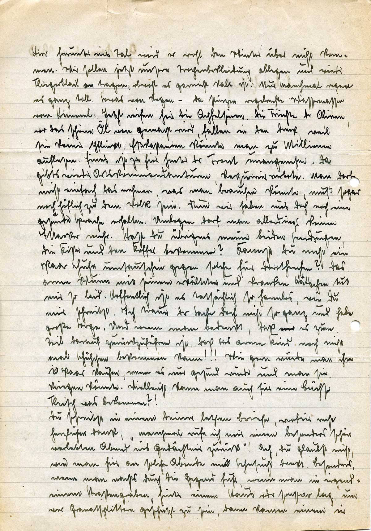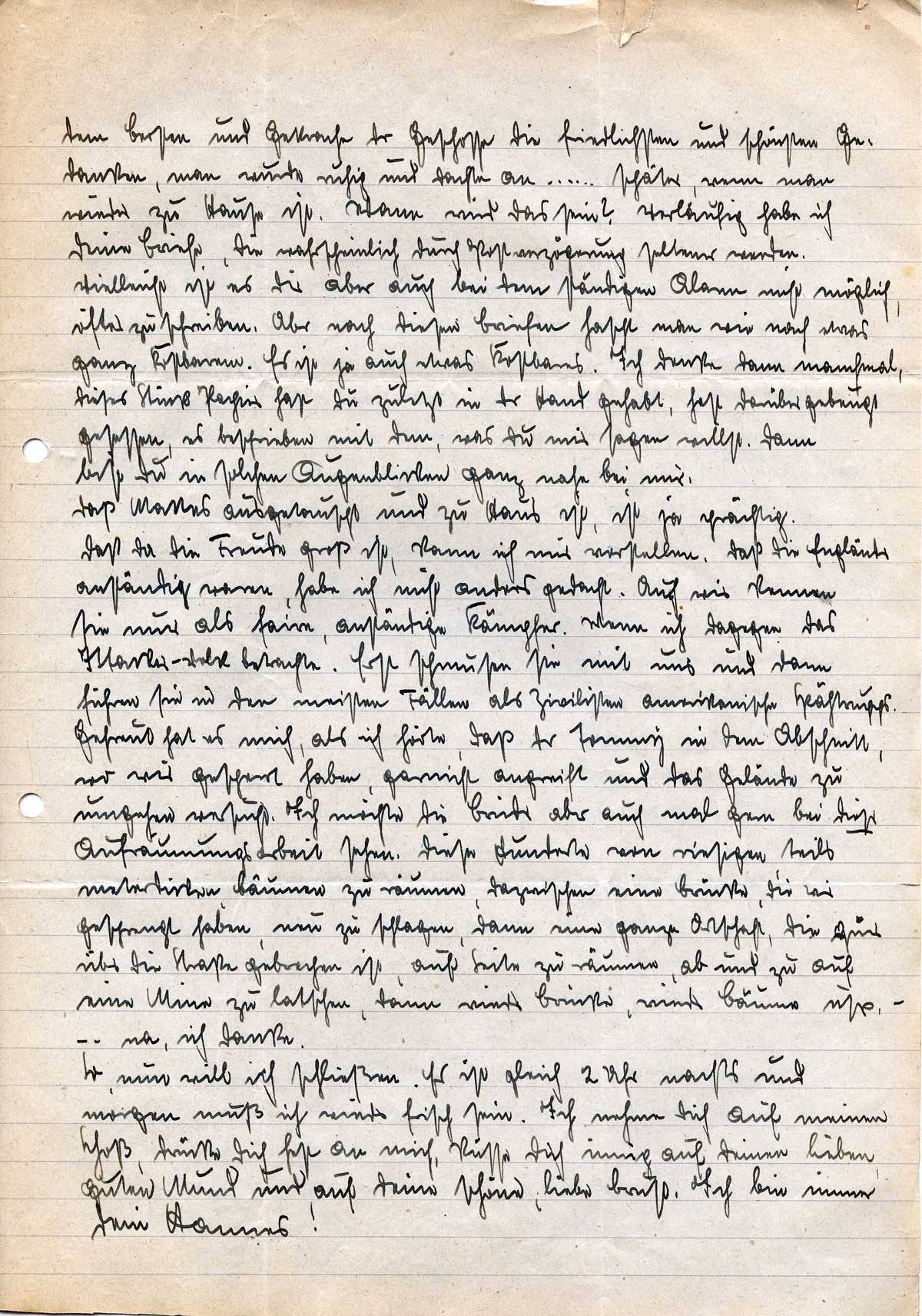 dem Bersten und Gekrache der Geschosse die friedlichsten und schönsten Gedanken, man wurde ruhig und dachte an . . . . . . später, wenn man wieder zu Hause ist. Wann wird das sein? Vorläufig habe ich Deine Briefe, die wahrscheinlich durch Postverzögerung seltener werden. Vielleicht ist es Dir aber auch bei dem ständigen Alarm nicht möglich, öfter zu schreiben. Aber nach diesen Briefen hascht man wie nach etwas ganz Kostbarem. Es ist ja auch etwas Kostbares. Ich denke dann manchmal, dieses Stück Papier hast Du zuletzt in der Hand gehabt, hast darüber gebeugt gesessen, es beschrieben mit dem, was Du mir sagen willst. Dann bist Du in solchen Augenblicken ganz nahe bei mir.