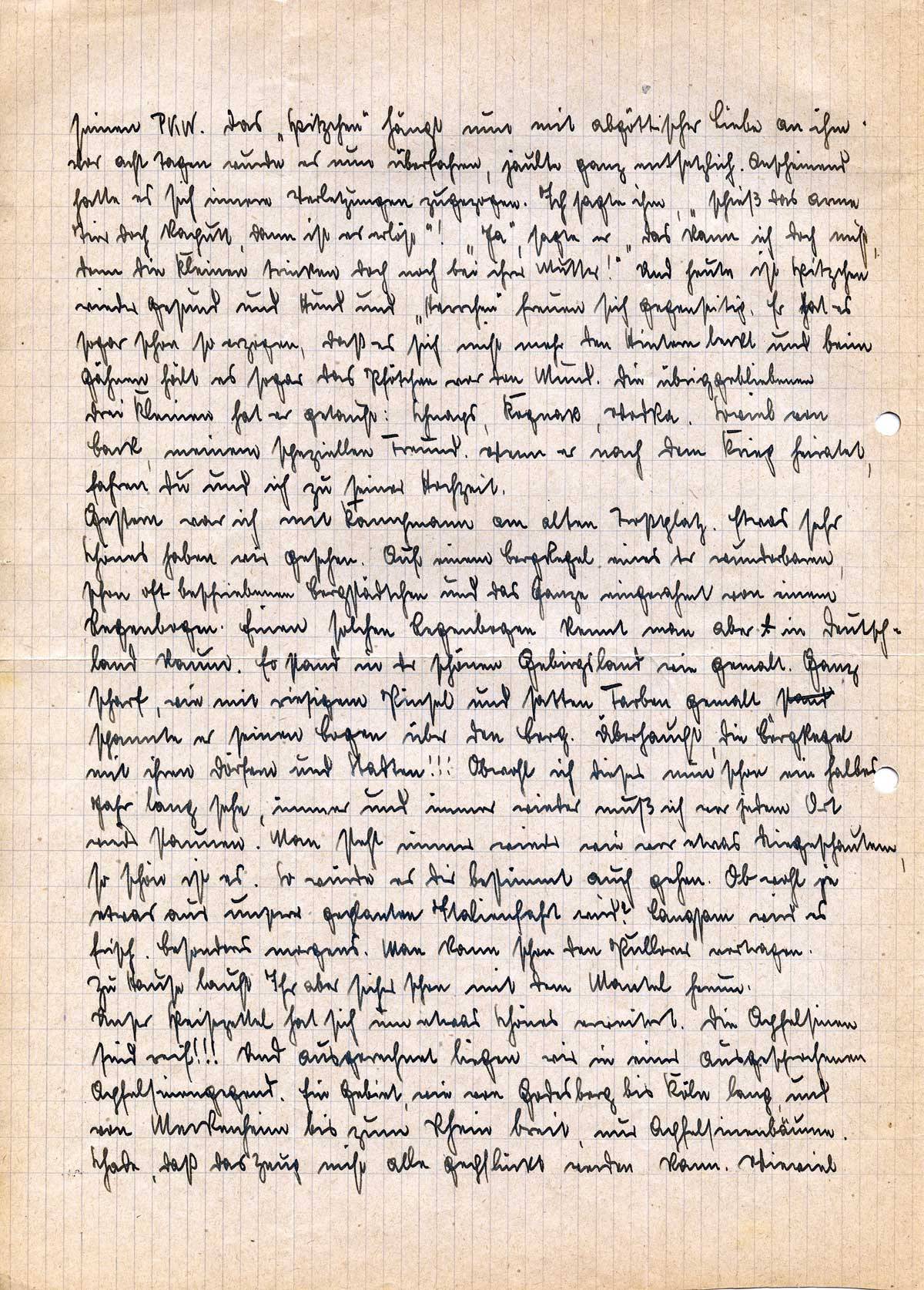 seinen PKW. Das „Spitzchen“ hängt nun mit abgöttischer Liebe an ihm. Vor acht Tagen wurde es nun überfahren, jaulte ganz entsetzlich. Anscheinend hatte es sich innere Verletzungen zugezogen. Ich sagte ihm, „schieß das arme Tier doch kaputt, dann ist es erlöst“! „Ja“, sagte er, „das kann ich doch nicht, denn die Kleinen trinken doch noch bei ihrer Mutter!“ Und heute ist Spitzchen wieder gesund und Hund und „Herrchen“ freuen sich gegenseitig. Er hat es sogar schon so erzogen, daß es sich nicht mehr den Hintern leckt und beim Gähnen hält es sogar das Pfötchen vor den Mund. Die übriggebliebenen drei Kleinen hat er getauft. Schnaps, Kognak, Wodka. Soviel von Back, meinem speziellen Freund. Wenn er nach dem Krieg heiratet, fahren Du und ich zu seiner Hochzeit.