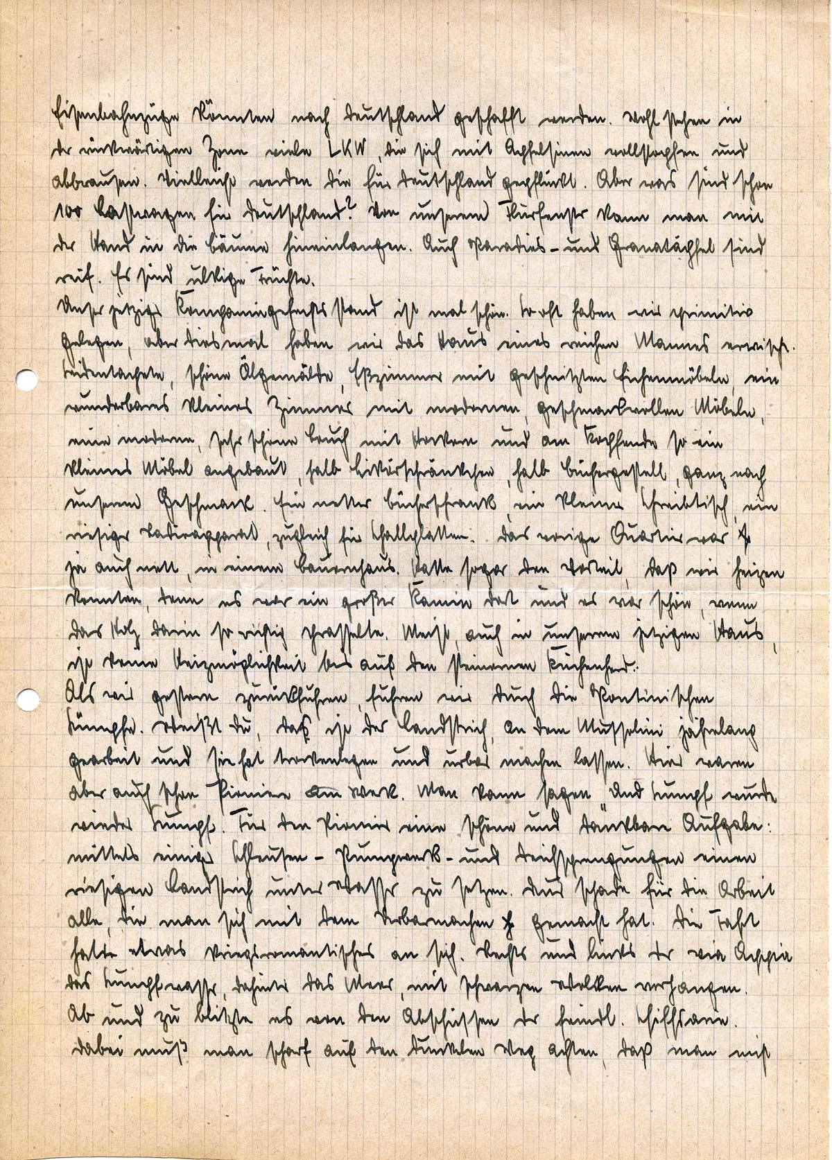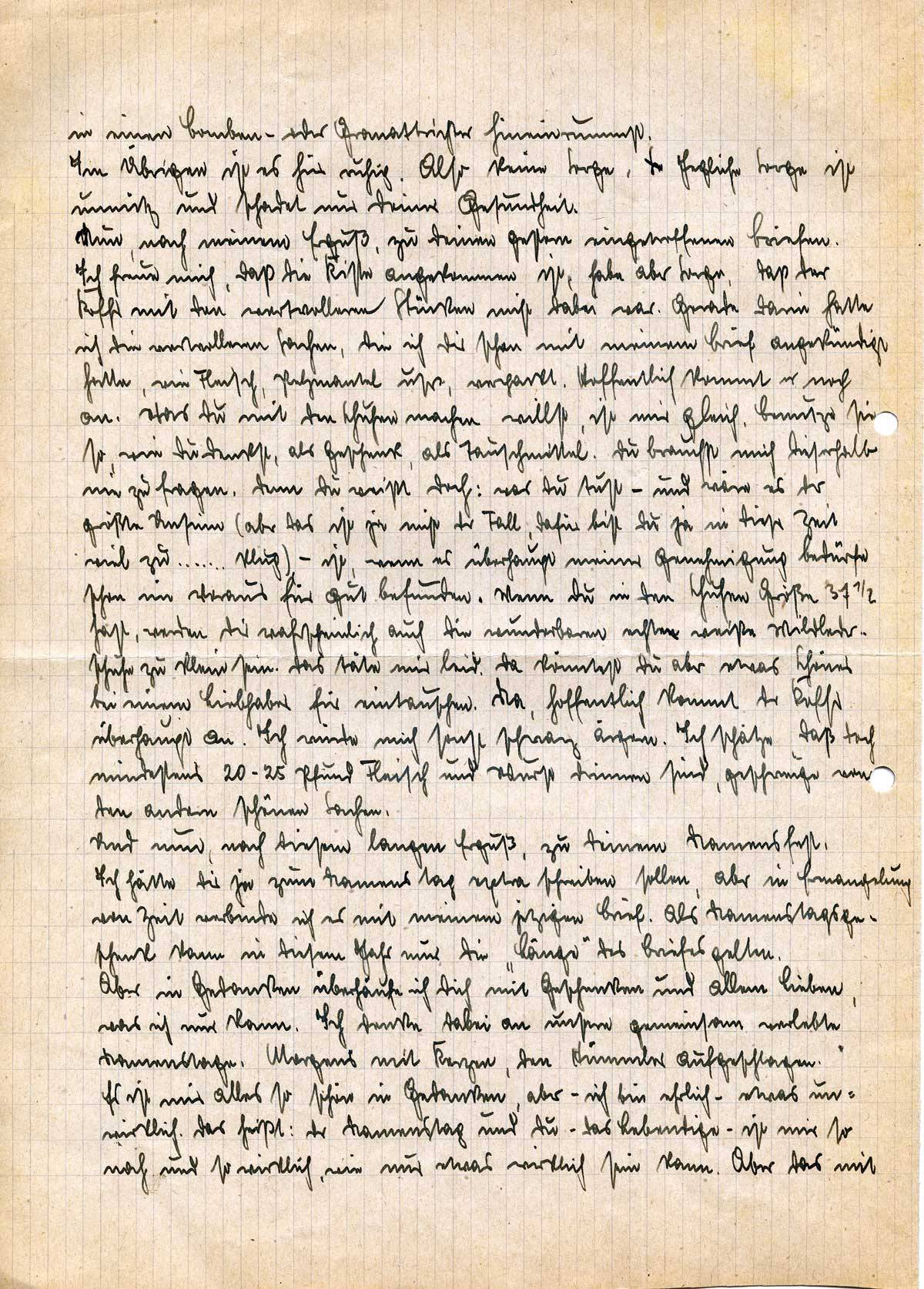 Nun, nach meinem Erguß, zu Deinen gestern eingetroffenen Briefen. Ich freue mich, daß die Kiste angekommen ist, habe aber Sorge, daß der Koffer mit den wertvolleren Stücken nicht dabei war. Gerade darin hatte ich die wertvolleren Sachen, die ich Dir schon mit meinem Brief angekündigt hatte, wie Fleisch, Pelzmantel usw., verpackt. Hoffentlich kommt er noch an. Was Du mit den Schuhen machen willst, ist mir gleich. Benutze sie so, wie Du denkst, als Geschenk, als Tauschmittel. Du brauchst mich dieserhalb nie zu fragen. Denn Du weißt doch: was Du tust – und wäre es der größte Unsinn (aber das ist ja nicht der Fall, dafür bist Du ja in dieser Zeit viel zu ……. klug) – ist, wenn es überhaupt meiner Genehmigung bedürfe schon im Voraus für gut befunden. Wenn Du in den Schuhen Größe 37½ hast, werden Dir wahrscheinlich auch die wunderbaren echten weißen Wildlederschuhe zu klein sein. Das täte mir leid. Da könntest Du aber was Schönes bei einem Liebhaber für eintauschen. Na, hoffentlich kommt der Koffer überhaupt an. Ich würde mich sonst schwarz ärgern. Ich schätze, daß doch mindestens 20 – 25 Pfund Fleisch und Wurst drinnen sind, geschweige von den anderen schönen Sachen.