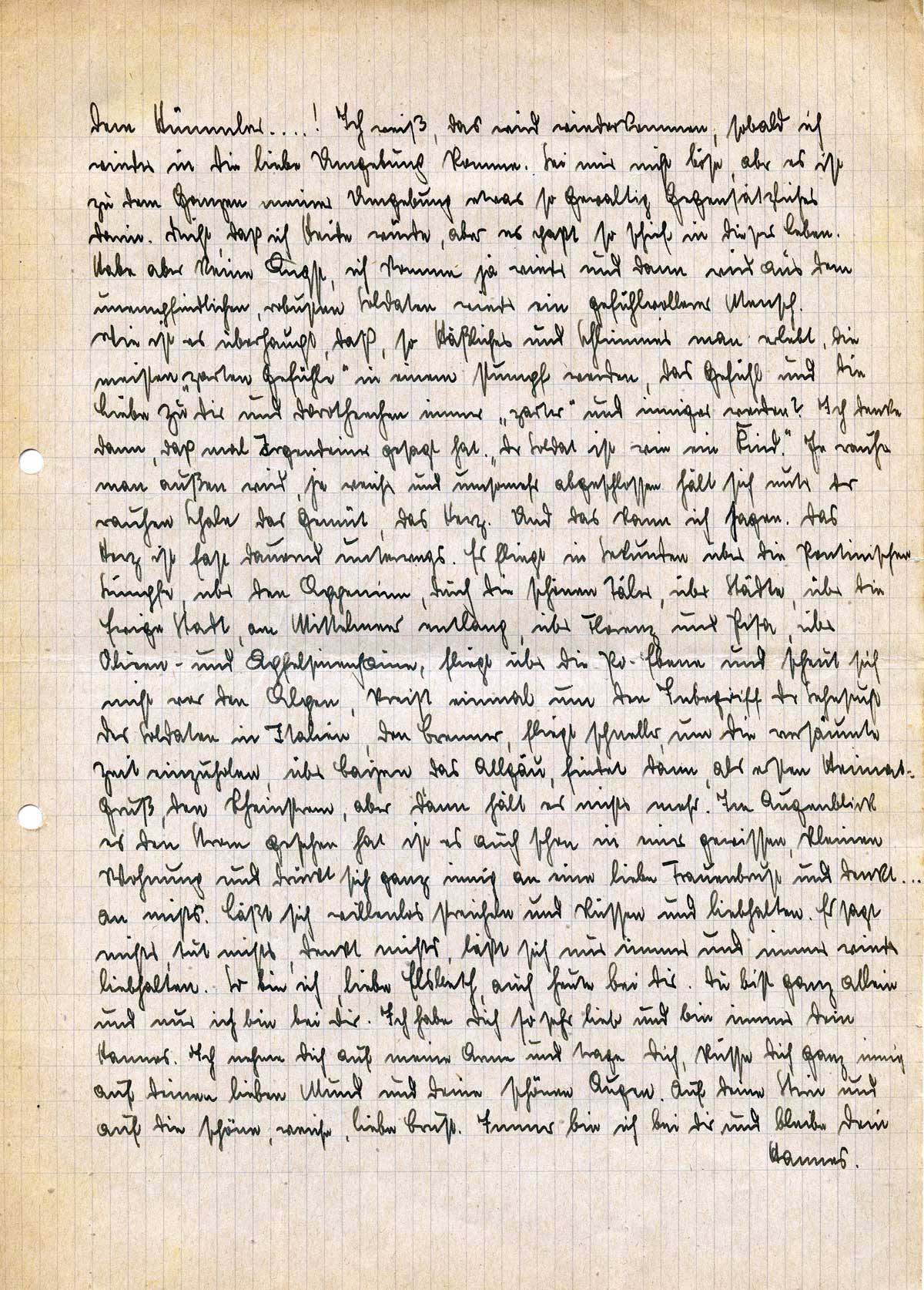 Und das kann ich sagen. Das Herz ist fast dauernd unterwegs. Es fliegt in Sekunden über die Pontinischen Sümpfe, über den Apennin, durch die schönen Täler, über Städte, über die Ewige Stadt, am Mittelmeer entlang, über Florenz und Pisa, über Oliven- und Apfelsinenhaine, fliegt über die Po-Ebene und scheut sich nicht vor den Alpen, kreist einmal um den Inbegriff der Sehnsucht der Soldaten in Italien, den Brenner, fliegt schneller, um die versäumte Zeit einzuholen, über Bayern, das Allgäu, findet dann, als ersten Heimatgruß, den Rheinstrom, aber dann hält es nichts mehr. Im Augenblick es den Strom gesehen hat ist es auch schon in einer gewissen, kleinen Wohnung und drückt sich ganz innig an eine liebe Frauenbrust und denkt . . . an nichts. Läßt sich willenlos streicheln und küssen und liebhalten. Es sagt nichts, tut nichts, denkt nichts, läßt sich nur immer und immer wieder liebhalten.