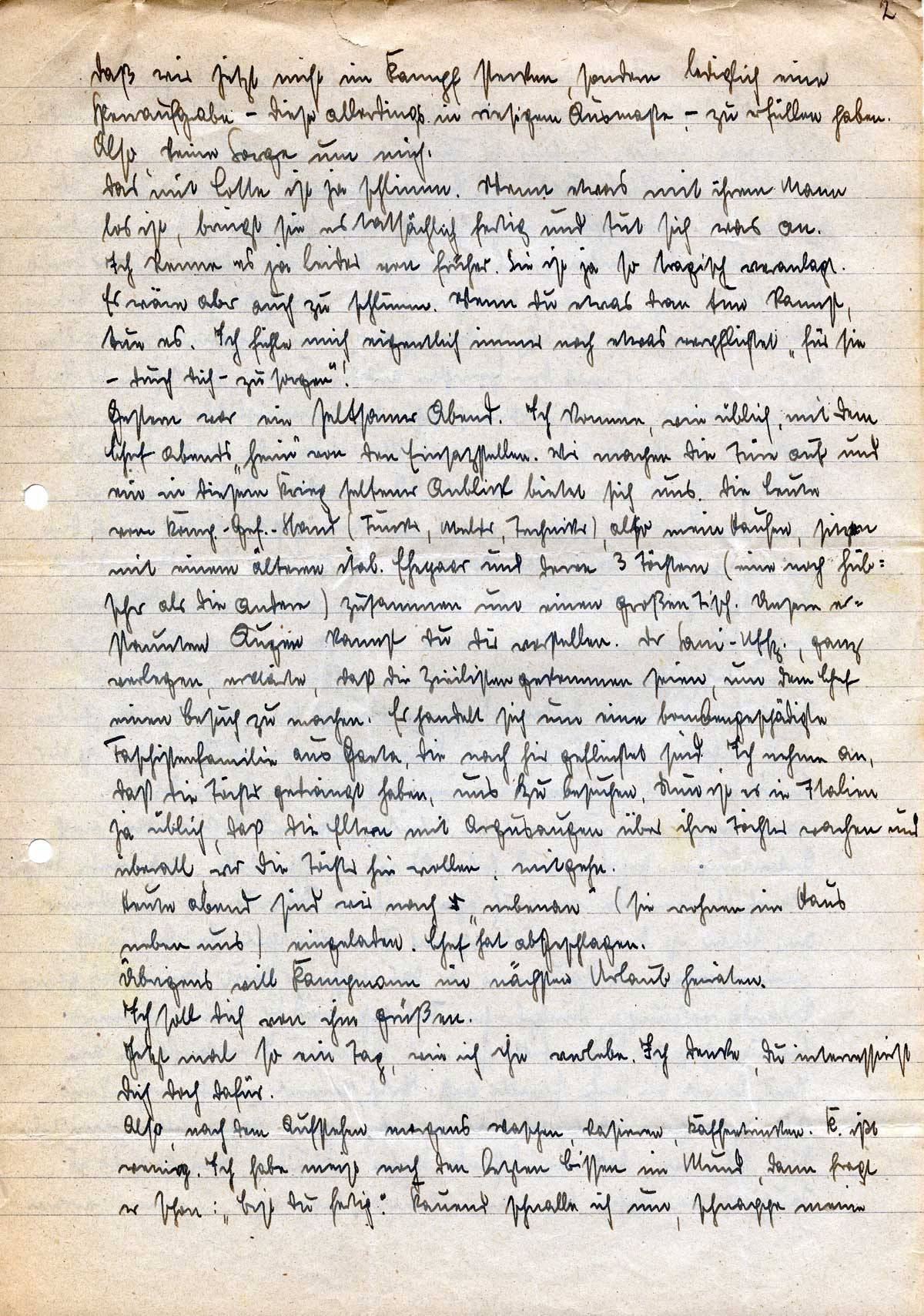 In Deinem letzten Brief schreibst Du von meinem „Gesundheitszustand“! Ich mußte etwas lachen. Das hörte sich an, als ob man von einem Schwerkranken spricht. Wenn Du mich hier so sehen könntest, im Vollbesitz meiner „körperlichen und geistigen Kräfte“, würdest Du Dir ein richtiges Bild machen können. Also, mir fehlt nichts, aber auch rein garnichts, noch nicht einmal Durchfall habe ich. Nur ein Hautjucken, das aber nur unangenehm ist und sonst nichts. Kampmann führt die Kompanie schon wieder eine Woche. Es geht ihm besser. Das Knie heilt, wenn auch langsam, aber es heilt. Heilen tun hier ja kaum Wunden. Hier eitert alles monatelang. Hat man einen Flohstich aufgekratzt, hast Du ein halbes Jahr lang mit diesem verfl. Eiter Schererei. Besonders die sogenannten Tropengeschwüre sind eklig. Wir haben Leute in der Kompanie, die die schon so lange haben, wie sie in Italien sind. Ich habe allerdings noch nichts damit zu tun gehabt — Gott sei Dank! Also, um meine Gesundheit mach Dir keine Sorge. Besonders aber auch keine Sorge um mich selbst. Ich versichere Dir ganz ehrlich,