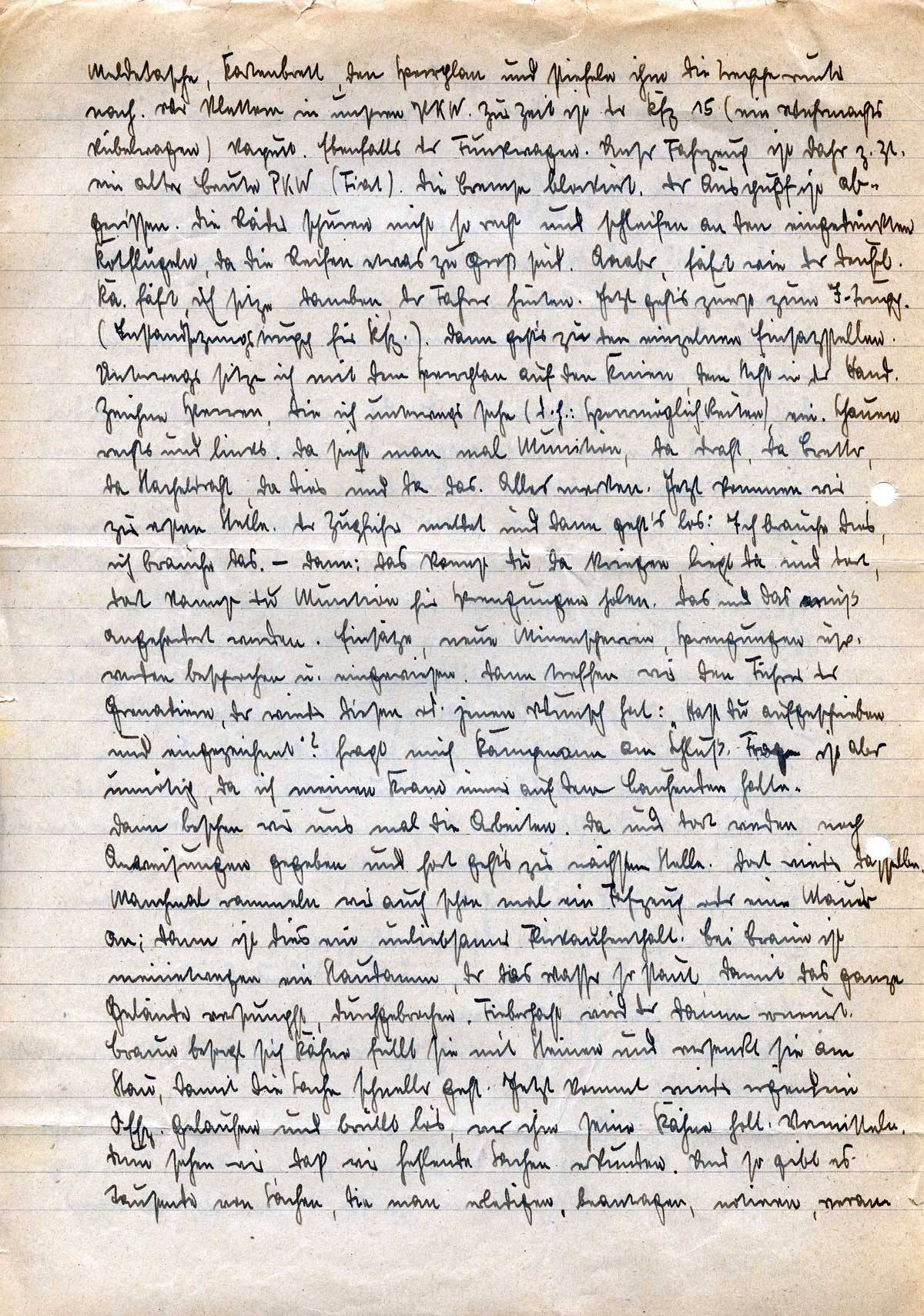 Meldetasche, Kartenbrett, den Sperrplan und stiefele ihm die Treppe runter nach. Wir klettern in unseren PKW. Zur Zeit ist der Kfz 15 (ein Wehrmachts-Kübelwagen) kaputt. Ebenfalls der Funkwagen. Unser Fahrzeug ist daher z. Zt. ein alter Beute-PKW (Fiat). Die Bremse blockiert. Der Auspuff ist abgerissen. Die Räder spuren nicht so recht und schleifen an den eingedrückten Kotflügeln, da die Reifen etwas zu groß sind. Aaaber, fährt wie der Deufel. Ka. fährt, ich sitze daneben, der Fahrer hinten. Jetzt geht’s zuerst zum I-Trupp (Instandsetzungstrupp für Kfz.). Dann geht’s zu den einzelnen Einsatzstellen. Unterwegs sitze ich mit dem Sperrplan auf den Knien, dem Stift in der Hand. Zeichne Sperren, die ich unterwegs sehe (d. h.: Sperrmöglichkeiten), ein. Schauen rechts und links. Da sieht man mal Munition, da Draht, da Bretter, da Stacheldraht, da dies und da das. Alles merken. Jetzt kommen wir zur ersten Stelle. Der Zugführer meldet und dann geht’s los: Ich brauche dies, ich brauche das. – Dann: Das kannst Du da kriegen, liegt da und dort, dort kannst Du Munition für Sprengungen holen. Das und das muß angefordert werden. Einsätze, neue Minensperren, Sprengungen usw. werden besprochen u. eingewiesen. Dann treffen wir den Führer der Grenadiere, der wieder diesen od. jenen Wunsch hat: „Hast Du aufgeschrieben und eingezeichnet?“ fragt mich Kampmann am Schluß. Frage ist aber unnötig, da ich meinen Kram immer auf dem Laufenden halte.