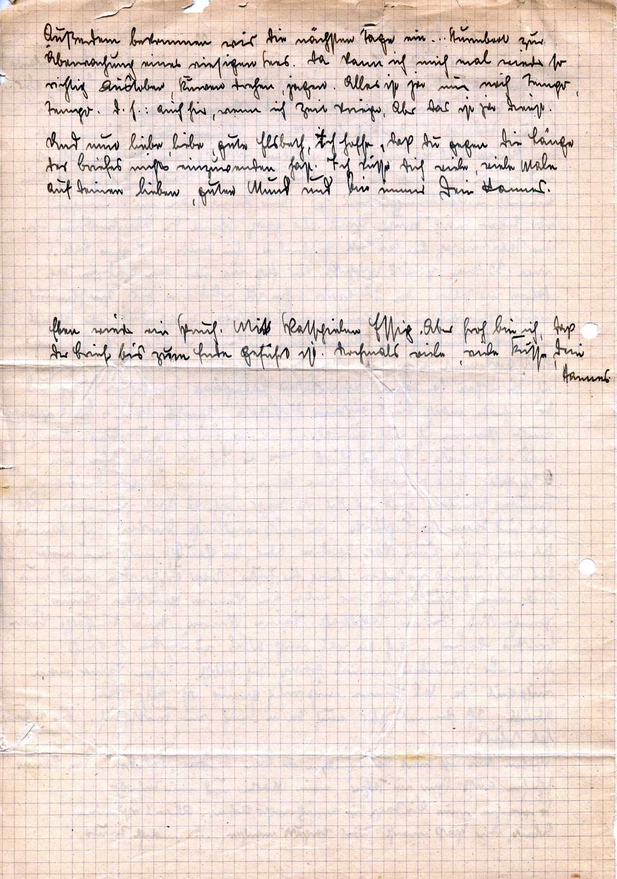 Und nun liebe, liebe gute Elsbeth, ich hoffe, daß Du gegen die Länge des Briefes nichts einzuwenden hast. Ich küsse Dich viele, viele Male auf Deinen lieben, guten Mund und bin immer Dein Hannes.