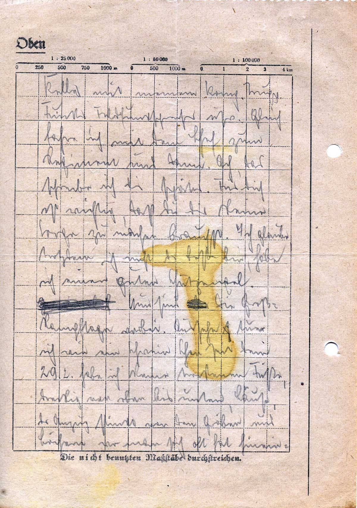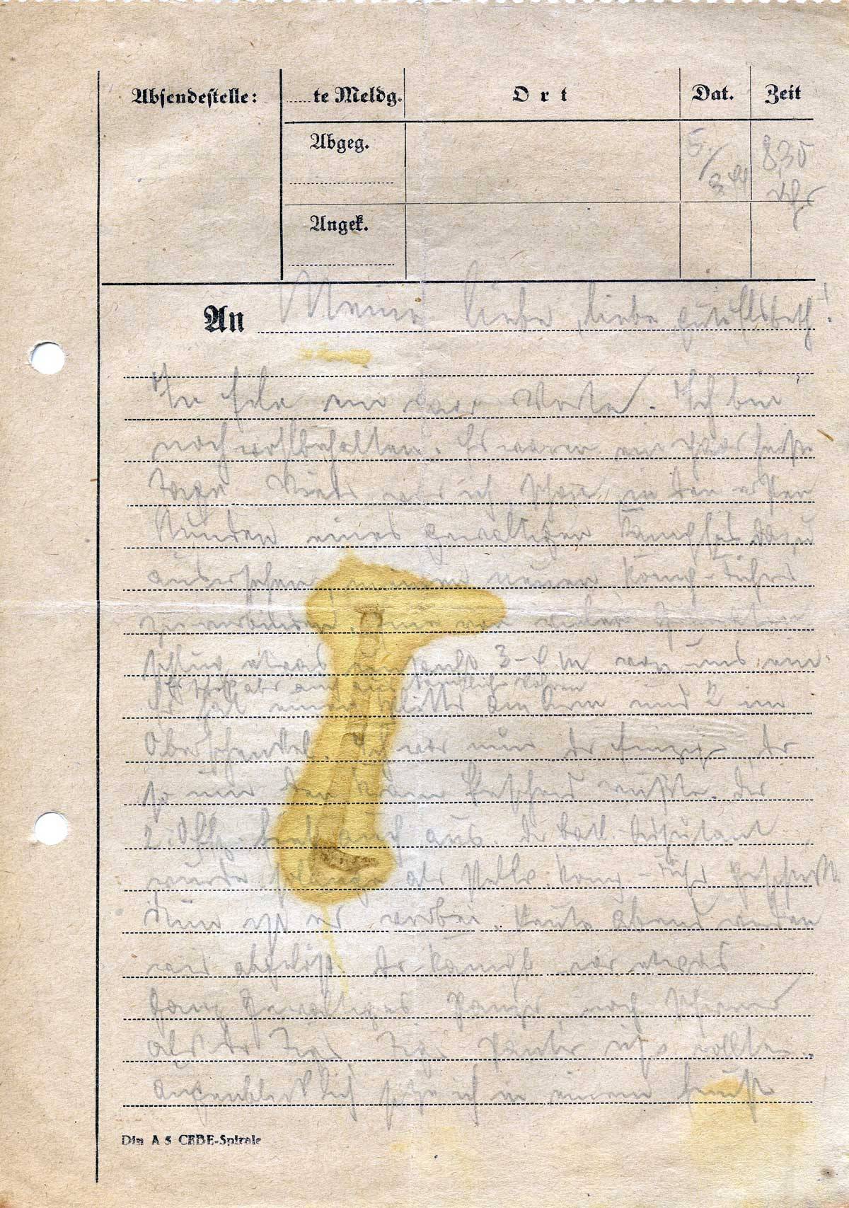 In Eile ein paar Worte. Ich bin noch wohlbehalten. Es waren ein paar heiße Tage. Wieder war ich schon in den ersten Stunden eines gewaltigen Kampfes dazu ausersehen, einen neuen Komp.-Führer zu verbinden. Eine von vielen Granaten schlug etwas unsanft 3 – 4 m vor uns ein. Es schoß aber auch aus sämtlichen Rohren. Er hat einen Splitter am Arm und 2 im Oberschenkel. Ich war nun der Einzige, der so um den Kram Bescheid wußte. Der 2. Offz. fiel auch aus. Der Batl.-Adjutant wurde so lange als stellv. Komp.-Führer geschickt. Nun ist es vorbei. Heute abend werden wir abgelöst. Der Kampf war etwas ganz Gewaltiges. Panzer, noch schwerer als der Tiger, Tiger, Panter usw. rollten. Augenblicklich sitze ich in einem feuchten
