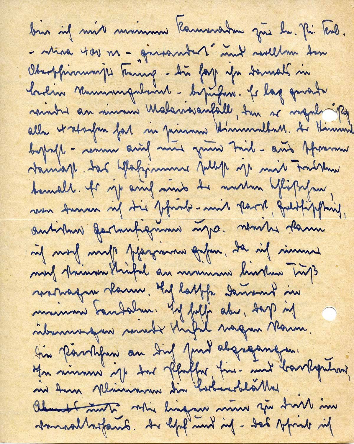 bin ich mit meinen Kameraden zur le.Pi.Kel. – etwa 400 m – „gewandert“ und wollten den Oberschirrmeister Kemp – Du hast ihn damals in Berlin kennengelernt – besuchen. Er lag gerade wieder an einem Malariaanfall, den er regelmäßig alle 4 Wochen hat, in seinem Himmelbett. Der Himmel besteht – wenn auch nur zum Teil – aus schwerem Damast. Das Schlafzimmer selbst ist mit Fresken bemalt. Es ist auch eins der netten Schlößchen, von denen ich Dir schrieb – mit Park, Goldfischteich, antiken Gartenfiguren usw. Weiter kann ich noch nicht spazieren gehen, da ich immer noch keinen Stiefel an meinem linken Fuß vertragen kann. Ich latsche dauernd in meinen Sandalen. Ich hoffe aber, daß ich übermorgen wieder Stiefel tragen kann. Die Päckchen an Dich sind abgegangen. In einem ist der Pfeffer, Eier- und Backpulver, in dem kleineren die Lorbeerblätter.