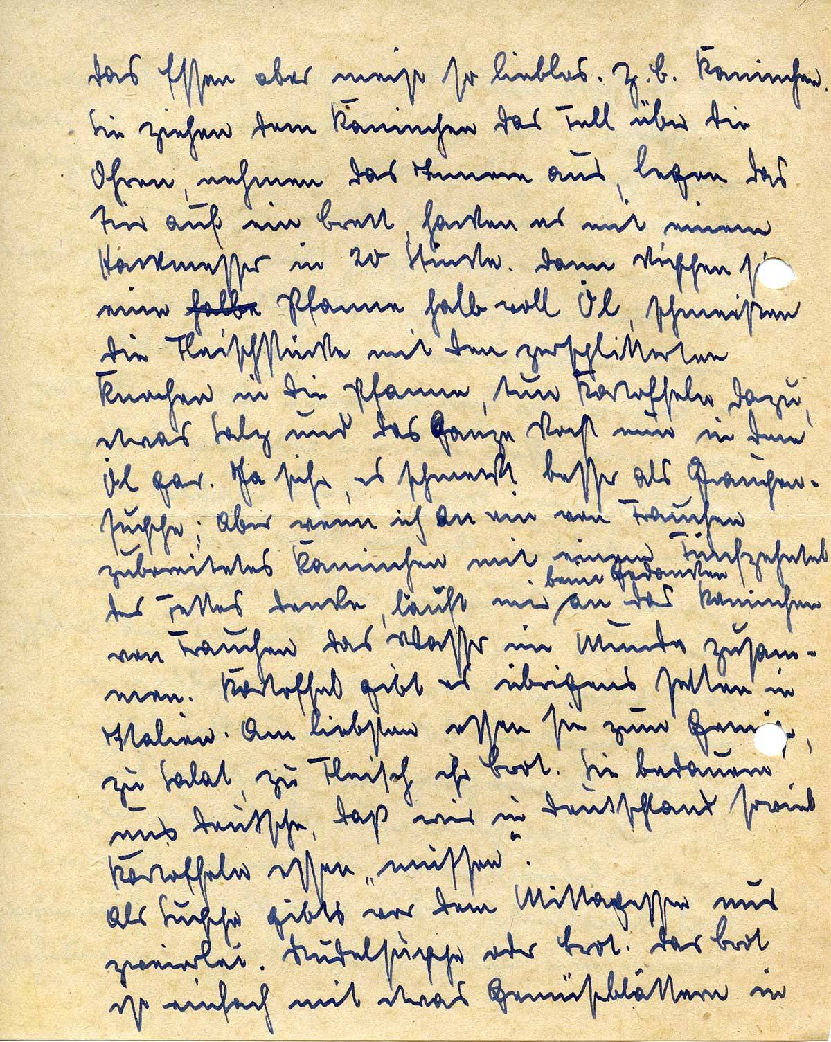 Nachher habe ich dann frische Wäsche angezogen, einen anderen Pullover und nun hoffe ich, daß ich läusefrei bin. Mein ganzer Körper ist zerstochen von diesen anhänglichen Tierchen. Nach Mittag – zu Mittag gab es Kaninchen mit Salat – haben wir zu 3 Kameraden uns einen Tisch in die Sonne draußen hingestellt und einen geruhsamen Skat gespielt. Anschließend