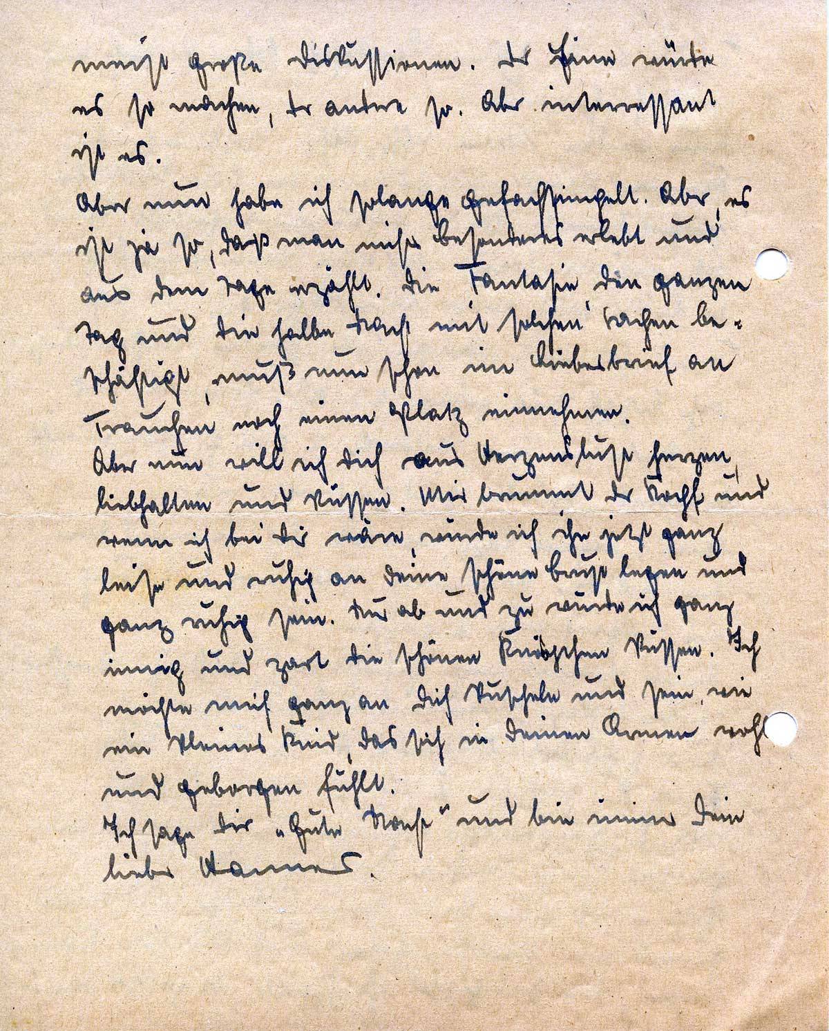 Über einen Monat bin ich jetzt schon wieder von Dir weg. Und bisher habe ich einen einzigen Brief von Dir bekommen. Ich bin überzeugt, daß Du öfter geschrieben hast, aber wo mögen sie nun stecken? Hoffentlich sind meine Päckchen für Dich alle angekommen. Es ist doch immerhin für viele hundert Mark Zeug und Du kannst es gut gebrauchen. Den Käse habe ich noch immer hier. Der hält sich monatelang.