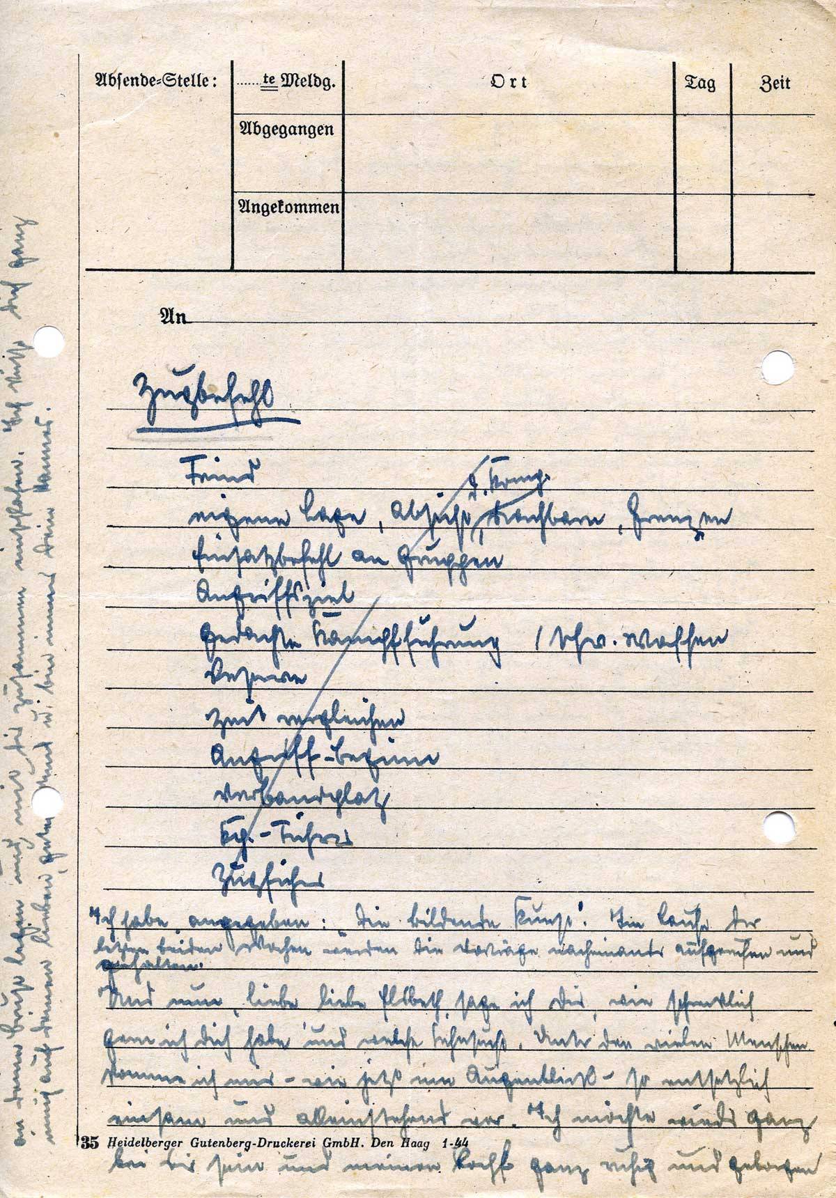 Wir haben gerade eine Geländeübung. Ich gehöre zum „Feind“ und wir liegen 600 m vor der angreifenden Truppe im Heidekraut und haben jetzt eine halbe Stunde nichts anderes zu tun als zu liegen und zu „beobachten“. In meiner Brieftasche habe ich dieses Stück Papier gefunden und benutze es dazu, Dir dieses vollzuschreiben. Heute Abend komme ich nämlich wieder nicht zum Schreiben, da eine Nachtübung steigt.