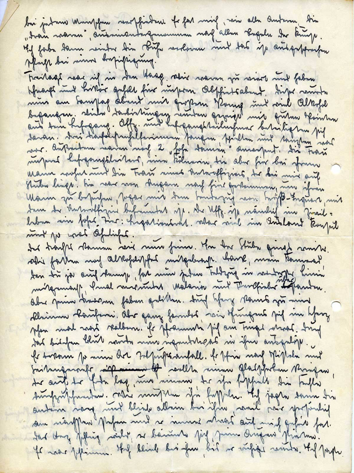 immer: Toni, Toni, was hast Du denn, nun sei doch schön ruhig usw., weißt Du, wie man ein kleines Kind beruhigt. Dann nahm ich ihm die Fessel ab, legte ihn ins Bett und setzte mich auf den Bettrand, steckte ihm eine Zigarette in den Mund. Auf Das Erwachen aus einem solchen Zustand ist seltsam. Wie er zuerst einen wieder ansah und „Hannes“ sagte und „wo bin ich?“ „Bin ich denn nicht in Rußland?“ usw.