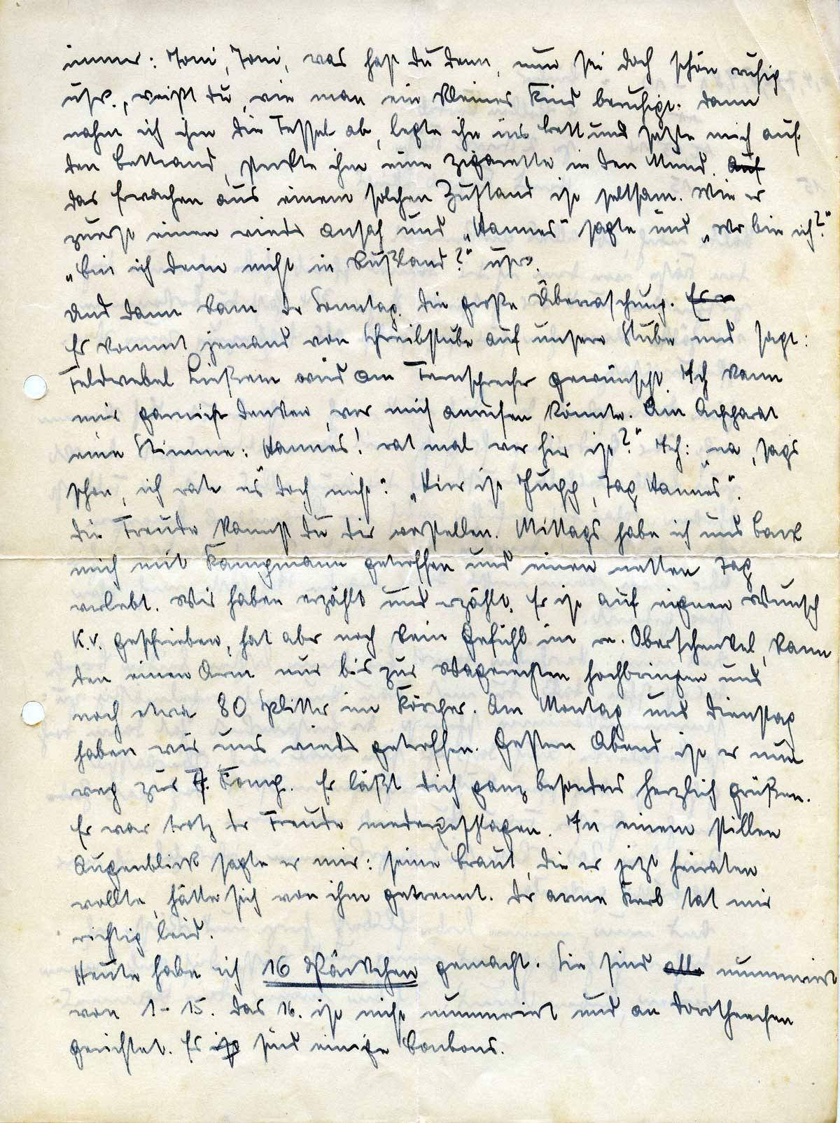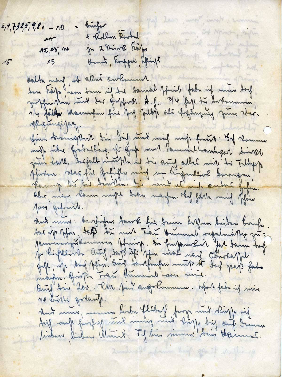 Und dann kam der Sonntag. Die große Überraschung. Es w Es kommt jemand von Schreibstube auf unsere Stube und sagt: Feldwebel Ließem wird am Fernsprecher gewünscht. Ich kann mir gar nicht denken, wer mich anrufen könnte. Am Apparat eine Stimme: „Hannes! rat mal wer hier ist?“ Ich: „na, sags schon, ich rate es doch nicht.“ „Hier ist Jupp, Tag Hannes.“ [Jupp, Elsbeths Bruder]. Die Freude kannst Du Dir vorstellen. Mittags habe ich und Back mich mit Kampmann getroffen und einen netten Tag verlebt. Wir haben erzählt und erzählt. Er ist auf eigenen Wunsch K.v. geschrieben, hat aber noch kein Gefühl im re. Oberschenkel, kann den einen Arm nur bis zur Wagerechten hochbringen und noch etwa 80 Splitter im Körper. Am Montag und Dienstag haben wir uns wieder getroffen. Gestern Abend ist er nun weg zur 7. Komp. Er läßt Dich ganz besonders herzlich grüßen.