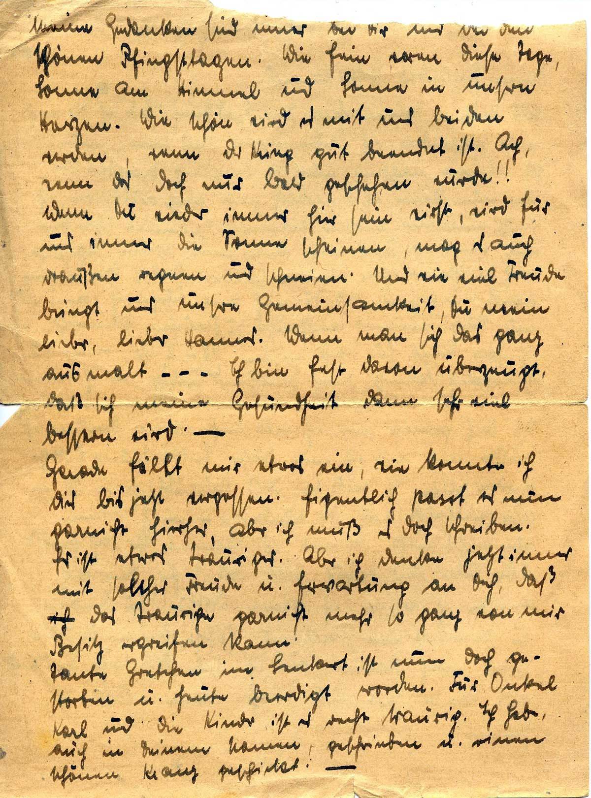 Wenn Du wieder immer hier sein wirst, wird für uns immer die Sonne scheinen, mag es auch draußen regnen und schneien. Und wie viel Freude bringt uns unsere Gemeinsamkeit, Du mein lieber, lieber Hannes. Wenn man sich das ganz ausmalt - - - Ich bin fest davon überzeugt, daß sich meine Gesundheit dann sehr viel bessern wird. –