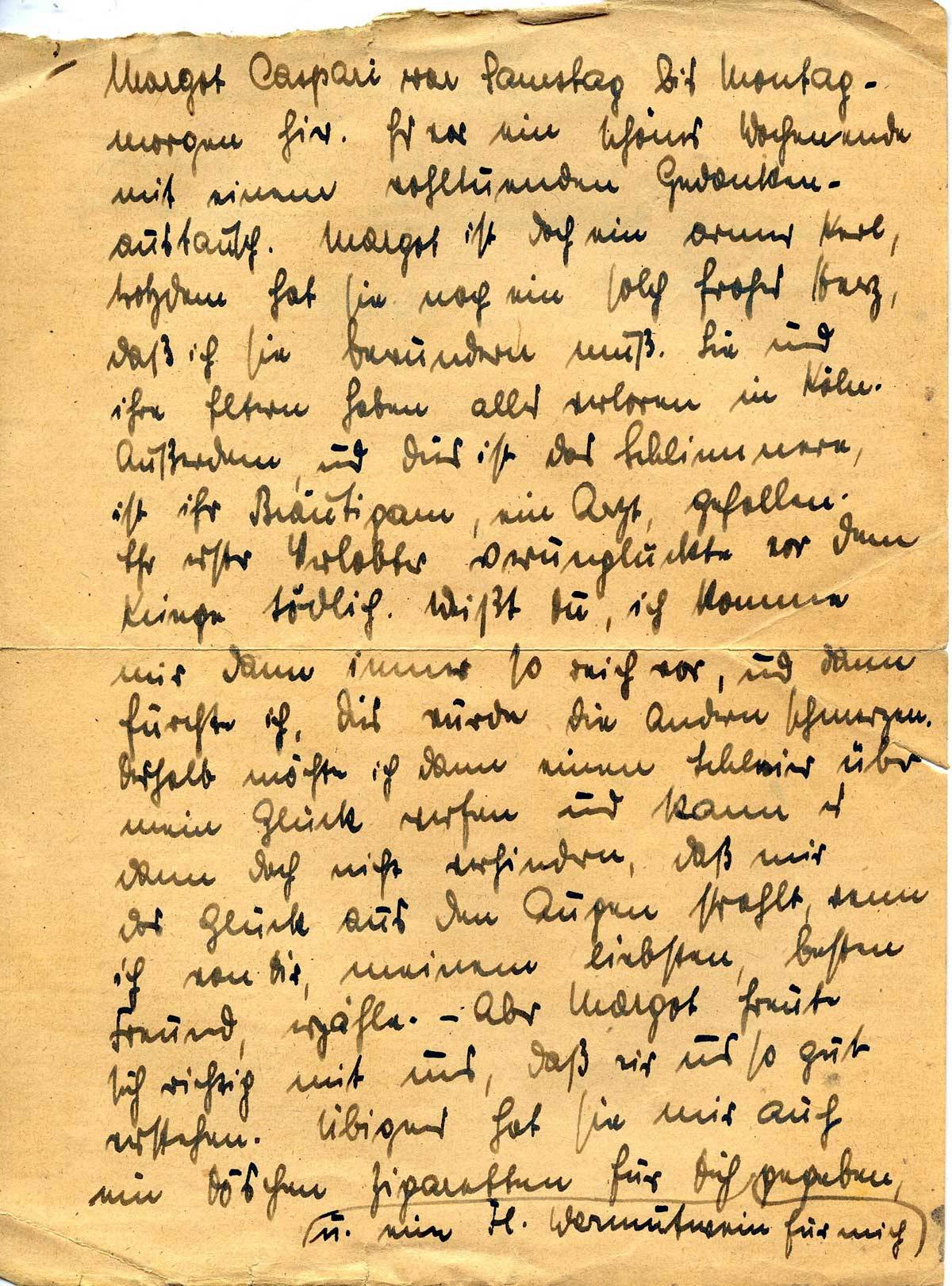 Margot Caspari war Samstag bis Montagmorgen hier. Es war ein schönes Wochenende mit einem wohltuenden Gedankenaustausch. Margot ist doch ein armer Kerl, trotzdem hat sie noch ein solch frohes Herz, daß ich sie bewundern muß. Sie und ihre Eltern haben alles verloren in Köln. Außerdem, und dies ist das Schlimmere, ist ihr Bräutigam, ein Arzt, gefallen. Ihr erster Verlobter verunglückte vor dem Kriege tödlich. Weißt Du, ich komme mir dann immer so reich vor, und dann fürchte ich, dies würde die andern schmerzen. Deshalb möchte ich dann einen Schleier über mein Glück werfen und kann es dann doch nicht verhindern, daß mir das Glück aus den Augen strahlt, wenn ich von Dir, meinem liebsten, besten Freund, erzähle. – Aber Margot freut sich richtig mit uns, daß wir uns so gut verstehen. Übrigens hat sie mir auch ein Döschen Zigaretten für Dich u. eine Fl. Wermutwein für mich gegeben,