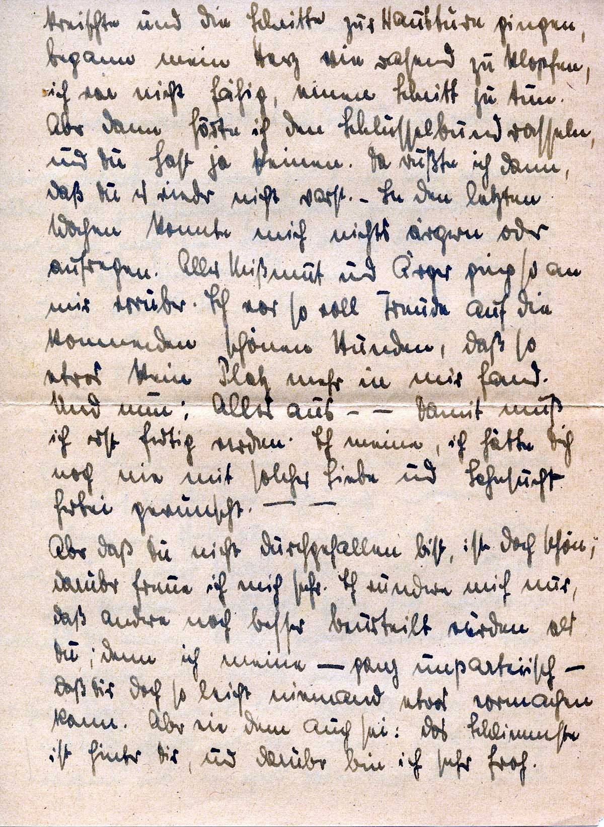 Aber dann hörte ich den Schlüsselbund rasseln, und Du hast ja keinen. Da wußte ich dann, daß Du es wieder nicht warst. – In den letzten Wochen konnte mich nichts ärgern oder aufregen. Aller Mißmut und Ärger ging so an mir vorüber. Ich war so voll Freude auf die kommenden schönen Stunden, daß so etwas kein Platz mehr in mir fand. Und nun: Alles aus – – Damit muß ich erst fertig werden. Ich meine, ich hätte Dich noch nie mit solcher Liebe und Sehnsucht herbei gewünscht. – –