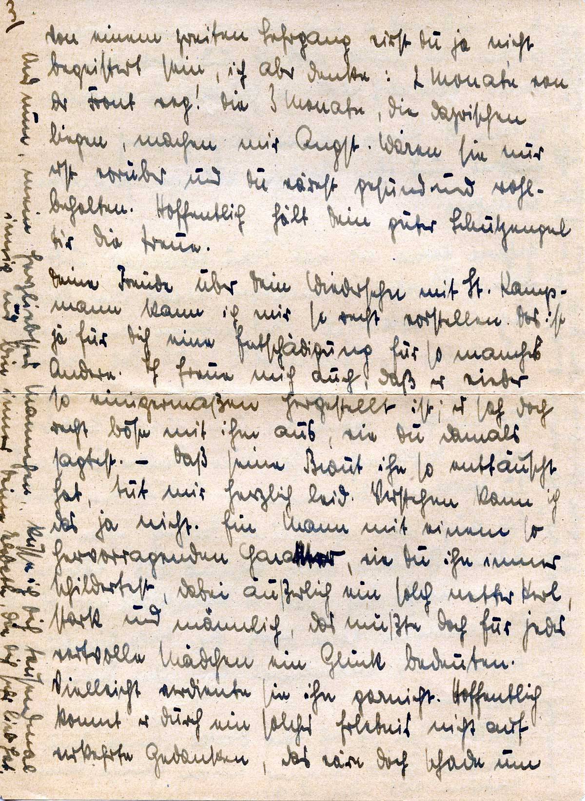 Deine Freude über Dein Wiedersehen mit Lt. Kampmann kann ich mir so recht vorstellen. Das ist ja für Dich eine Entschädigung für so manches Andere. Ich freue mich auch, daß er wieder so einigermaßen herstellt ist; es sah doch recht böse mit ihm aus, wie Du damals sagtest. – Daß seine Braut ihn so enttäuscht hat, tut mir herzlich leid. Verstehen kann ich das ja nicht. Ein Mann mit einem so hervorragenden Charakter, wie Du ihn immer schildertest, dabei äußerlich ein solch netter Kerl, stark und männlich, das müßte doch für jedes wertvolle Mädchen ein Glück bedeuten. Vielleicht verdiente sie ihn garnicht. Hoffentlich kommt er durch ein solches Erlebnis nicht auf verkehrte Gedanken, das wäre doch schade um