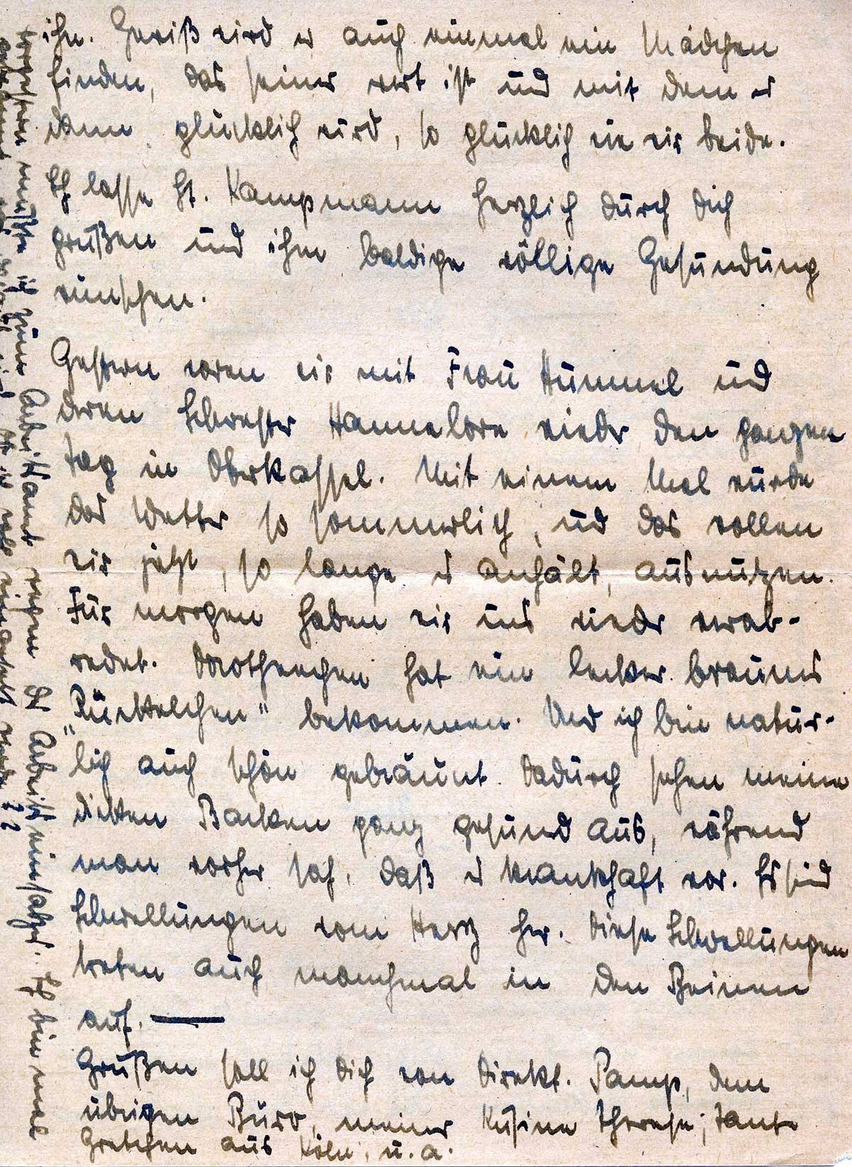 Grüßen soll ich Dich von Direkt. Pamp, dem übrigen Büro, meiner Kusine Therese, Tante Gretchen aus Köln u.a.
