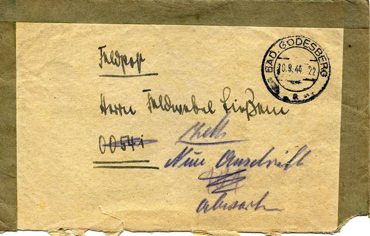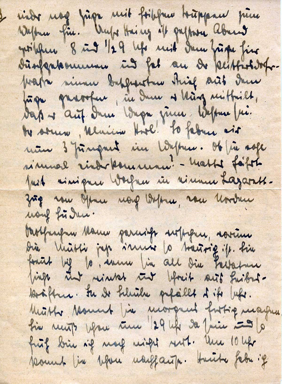 wieder noch Züge mit frischen Truppen zum Westen hin. Unser Heinz ist gestern Abend zwischen 8 und ½ 9 Uhr mit dem Zuge hier durchgekommen und hat an der Plittersdorferstraße einen beschwerten Brief aus dem Zuge geworfen, in dem er kurz mitteilt, daß er auf dem Wege zum Westen sei. Der arme kleine Kerl! So haben wir nun 3 Jungens im Westen. Ob sie wohl einmal wiederkommen? – Mattes fährt seit einigen Wochen in einem Lazarettzug von Osten nach Westen, von Norden nach Süden.