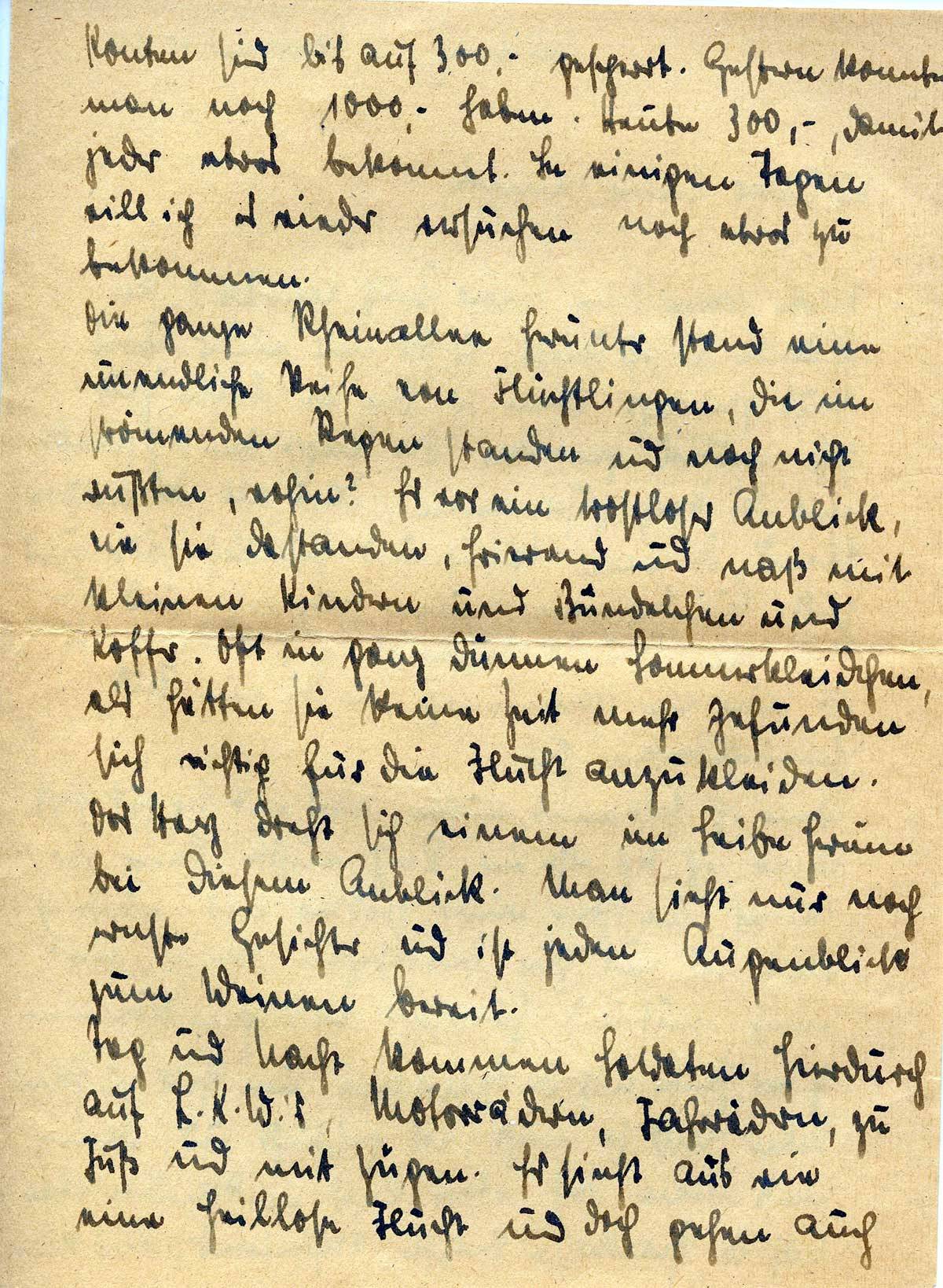 Die ganze Rheinallee herunter stand eine unendliche Reihe von Flüchtlingen, die im strömenden Regen standen und noch nicht wußten, wohin? Es war ein trostloser Anblick, wie sie dastanden, frierend und naß mit kleinen Kindern und Bündelchen und Koffer. Oft in ganz dünnen Sommerkleidchen, als hätten sie keine Zeit mehr gefunden sich richtig für die Flucht anzukleiden. Das Herz dreht sich einem im Leibe herum bei diesem Anblick. Man sieht nur noch ernste Gesichter und ist jeden Augenblick zum Weinen bereit.