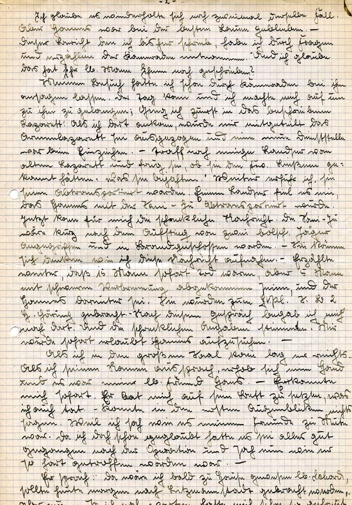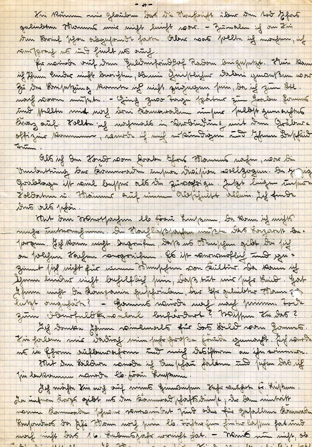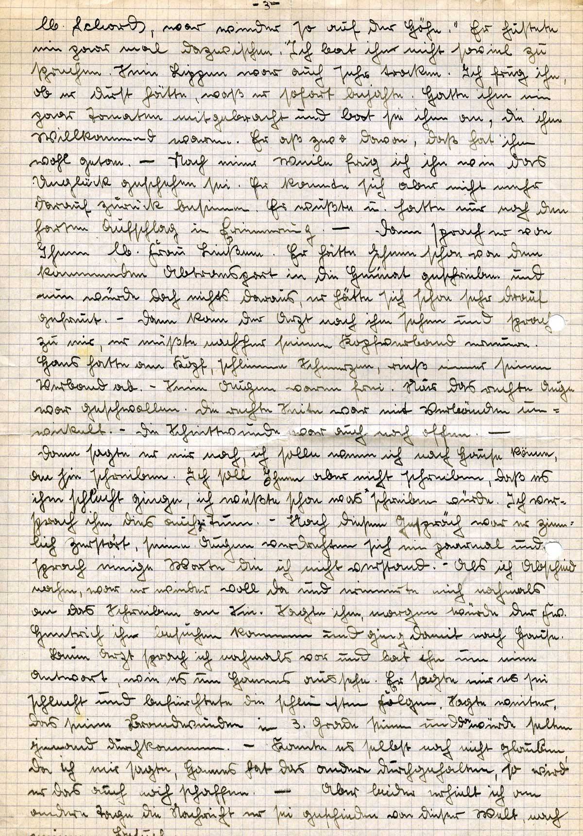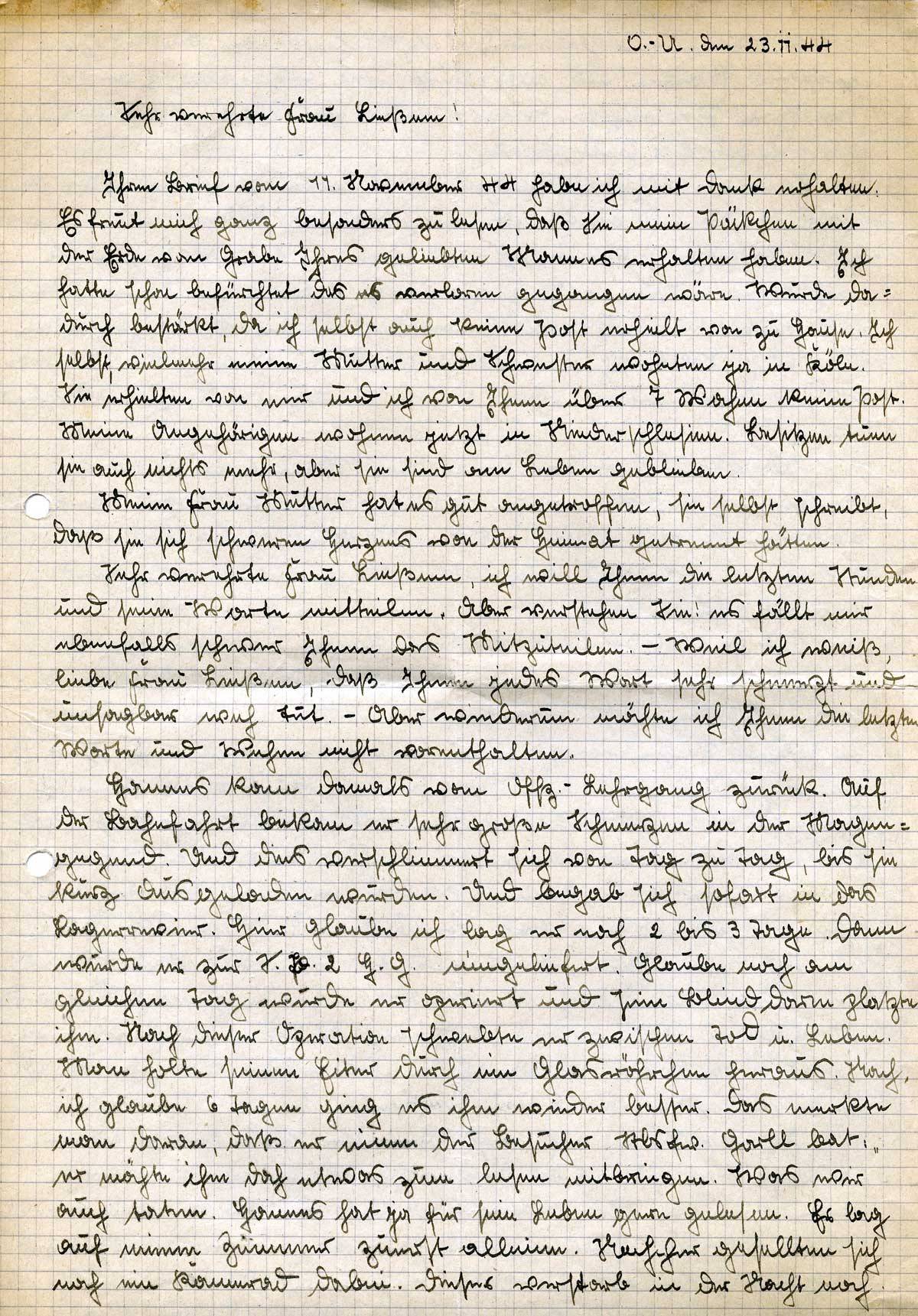 Dann sagte er mir noch, ich solle wenn ich nach Hause käme, an Sie schreiben. Ich soll Ihnen aber nicht schreiben, daß es ihm schlecht ginge, ich wüßte schon was ich Ihnen schreiben würde. Ich versprach ihm dies auch zu tuen. – Nach diesem Gespräch war er ziemlich zerstört, seine Augen verdrehten sich ein paarmal und sprach einige Worte, die ich nicht verstand. – Als ich Abschied nahm, war er wieder voll da und erinnerte mich nochmals an das Schreiben an Sie. Sagte ihm, morgen würde der Fw. Hentrich ihn besuchen kommen und ging damit nach Hause.