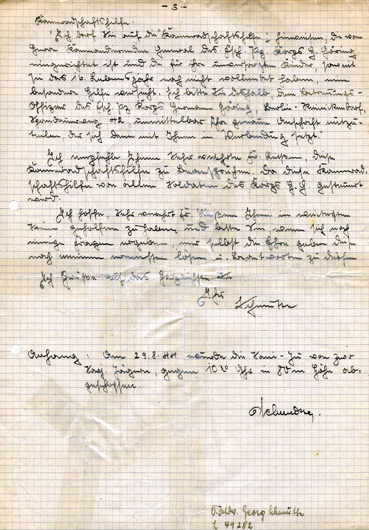 „Ich darf Sie auf die Kameradschaftshilfe“ hinweisen, die von Herrn Kommandierenden General des Fsch. Pz. Korps H. Göring eingerichtet ist, und die für ihre unversorgten Kinder, soweit sie das 16. Lebensjahr noch nicht vollendet haben, eine besondere Hilfe vorsieht. Ich bitte Sie deshalb, dem Betreuungs-Offizier des Fsch. Pz. Korps Hermann Göring, Berlin-Reinickendorf, Spandauerweg 42, unmittelbar Ihre genaue Anschrift mitzuteilen, der sich dann mit Ihnen in Verbindung setzt.“