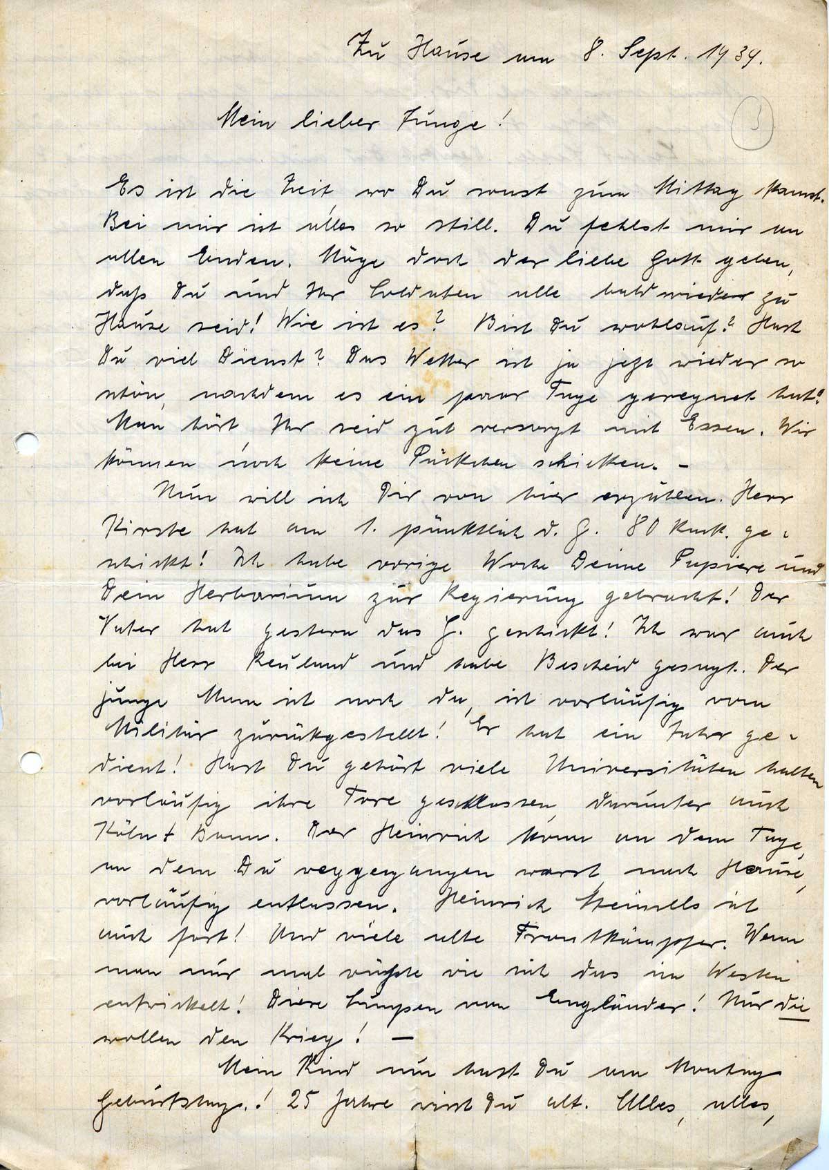 Nun will ich Dir von hier erzählen. Herr Kirste hat am 1. pünktlich d. G. 80 Rmk. geschickt! Ich habe vorige Woche Deine Papiere und Dein Herbarium zur Regierung gebracht! Der Vater hat gestern das G. geschickt! Ich war auch bei Herr Reuland und habe Bescheid gesagt. Der junge Mann ist noch da, ist vorläufig vom Militär zurückgestellt! Er hat ein Jahr gedient! Hast Du gehört viele Universitäten halten vorläufig ihre Tore geschlossen, darunter auch Köln + Bonn. Der Heinrich kam an dem Tage, an dem Du weggegangen warst, nach Hause, vorläufig entlassen. Heinrich Steimels[?] ist auch fort! Und viele alte Frontkämpfer. Wenn man nur mal wüßte wie sich das im Westen entwickelt! Diese Lumpen von Engländer! Nur die wollen den Krieg! –