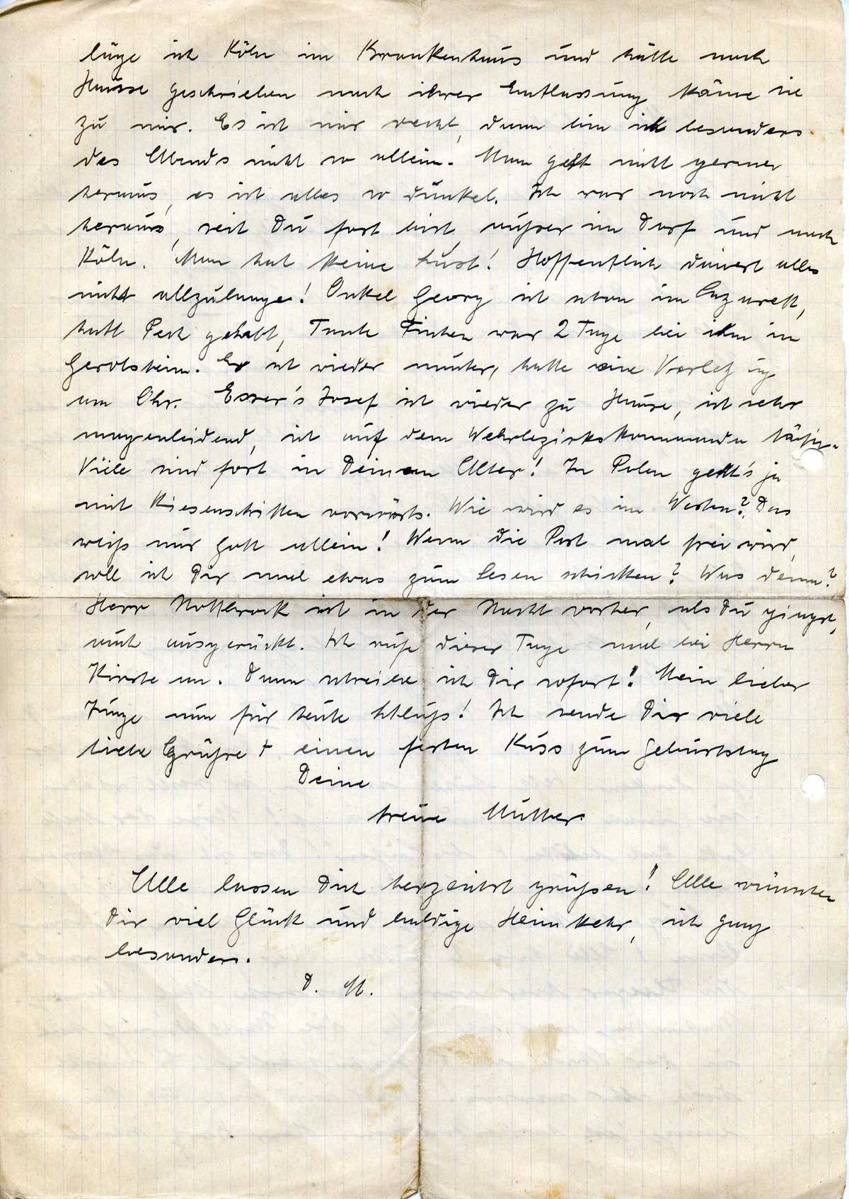 läge in Köln im Krankenhaus und hätte nach Hause geschrieben nach ihrer Entlassung käme sie zu mir. Es ist mir recht, dann bin ich besonders des Abends nicht so allein. Man geht nicht gerne heraus, es ist alles so dunkel. Ich war noch nicht heraus, seit Du fort bist, außer im Dorf und nach Köln. Man hat keine Lust! Hoffentlich dauert alles nicht allzulange! Onkel Georg ist schon im Lazarett, hatte Pech gehabt, Tante Finchen war 2 Tage bei ihm in Gerolstein. Er ist wieder munter, hatte eine Verletzung am Ohr. Esser’s Josef ist wieder zu Hause, ist sehr magenleidend, ist auf dem Wehrbezirkskommando tätig. Viele sind fort in Deinem Alter! In Polen geht’s ja mit Riesenschritten vorwärts. Wie wird es im Westen? Das weiß nur Gott allein! Wenn die Post mal frei wird, soll ich Dir mal etwas zum Lesen schicken? Was denn? Herr Nottbrack ist in der Nacht vorher, als Du gingst, auch ausgerückt. Ich rufe dieser Tage mal bei Herrn Kirste an. Dann schreibe ich Dir sofort! Mein lieber Junge, nun für heute Schluß! Ich sende Dir viele liebe Grüße + einen festen Kuss zum Geburtstag