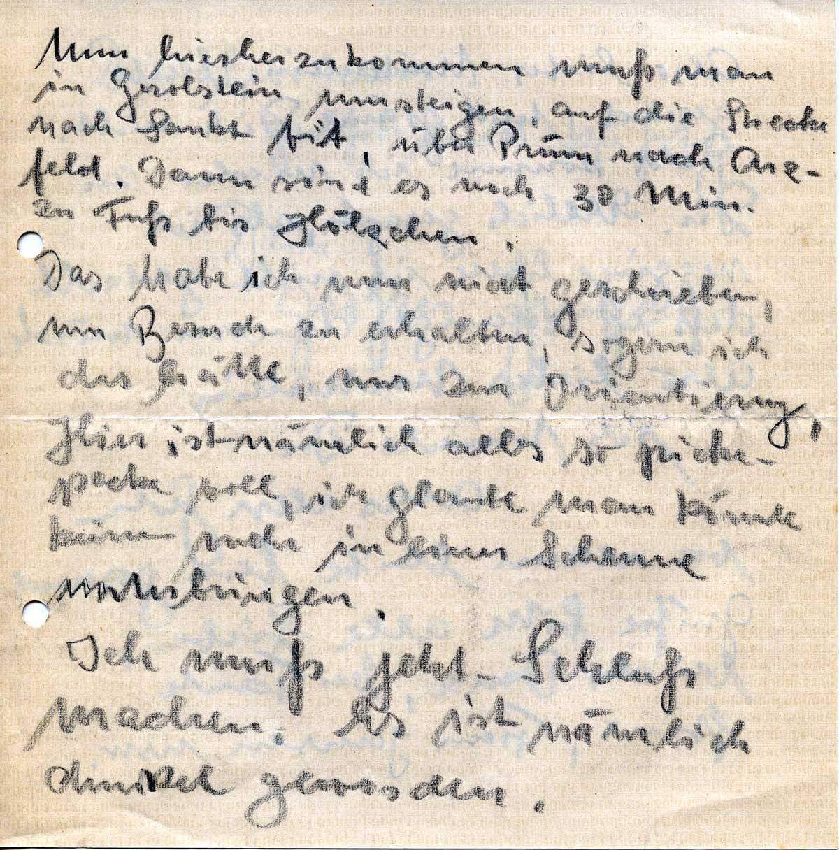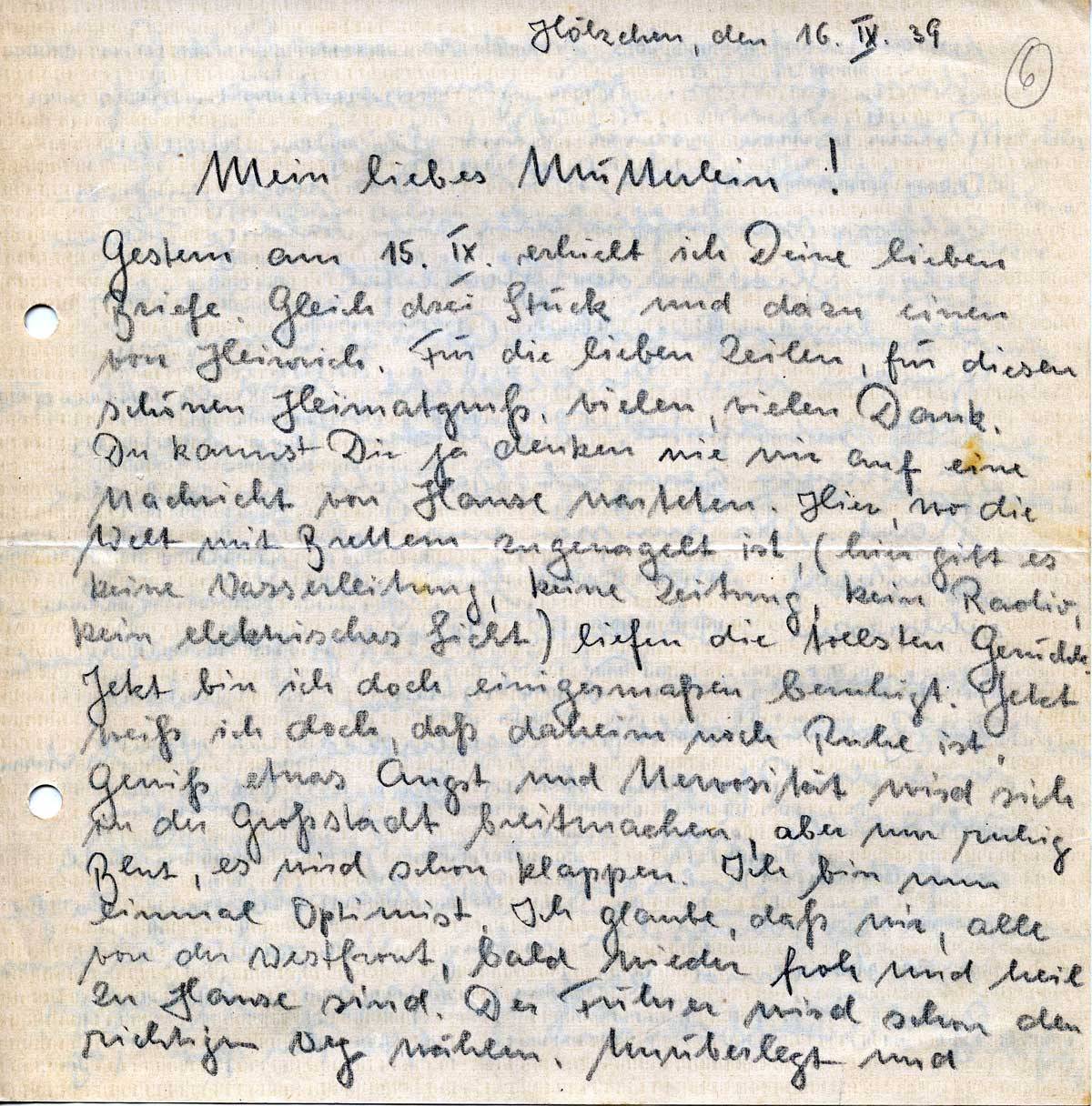 Gestern am 15.IX. erhielt ich Deine lieben Briefe. Gleich drei Stück und dazu einen von Heinrich. Für die lieben Zeilen, für diesen schönen Heimatgruß, vielen, vielen Dank. Du kannst Dir ja denken wie wir auf eine Nachricht von Hause warteten. Hier, wo die Welt mit Brettern zugenagelt ist, (hier gibt es keine Wasserleitung, keine Zeitung, kein Radio, kein elektrisches Licht) liefen die tollsten Gerüchte. Jetzt bin ich doch einigermaßen beruhigt. Jetzt weiß ich doch, daß daheim noch Ruhe ist.