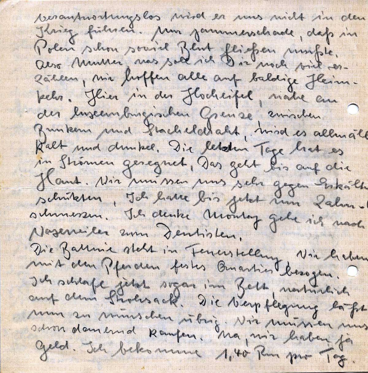 verantwortungslos wird er uns nicht in den Krieg führen. Nur jammerschade, daß in Polen schon soviel Blut fließen mußte. Also Mutter, was soll ich Dir noch viel erzählen, wir hoffen alle auf baldige Heimkehr. Hier in der Hocheifel, nahe an der luxemburgischen Grenze, zwischen Bunkern und Stacheldraht, wird es allmählich kalt und dunkel. Die letzten Tage hat es in Strömen geregnet. Das geht bis auf die Haut. Wir müssen uns sehr gegen Erkältung schützen. Ich hatte bis jetzt nur Zahnschmerzen. Ich denke Montag gehe ich nach Waxweiler zum Dentisten.