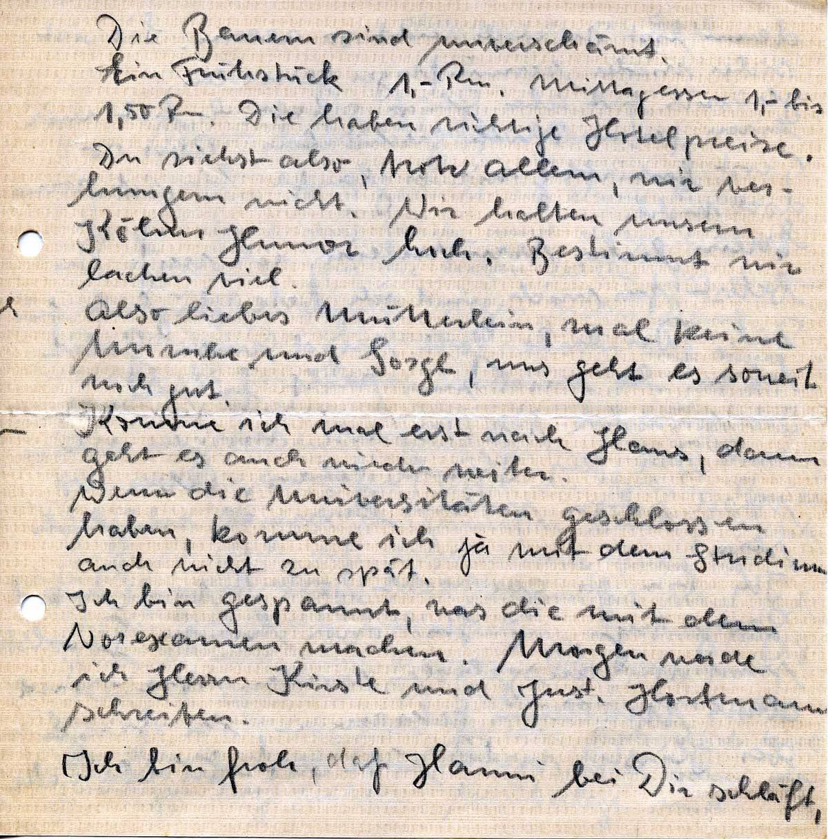 Ein Frühstück 1,- Rm. Mittagessen 1,- bis 1,50 Rm. Die haben richtige Hotelpreise. Du siehst also, trotz allem, wir verhungern nicht. Wir halten unsern Kölner Humor hoch. Bestimmt wir lachen viel.