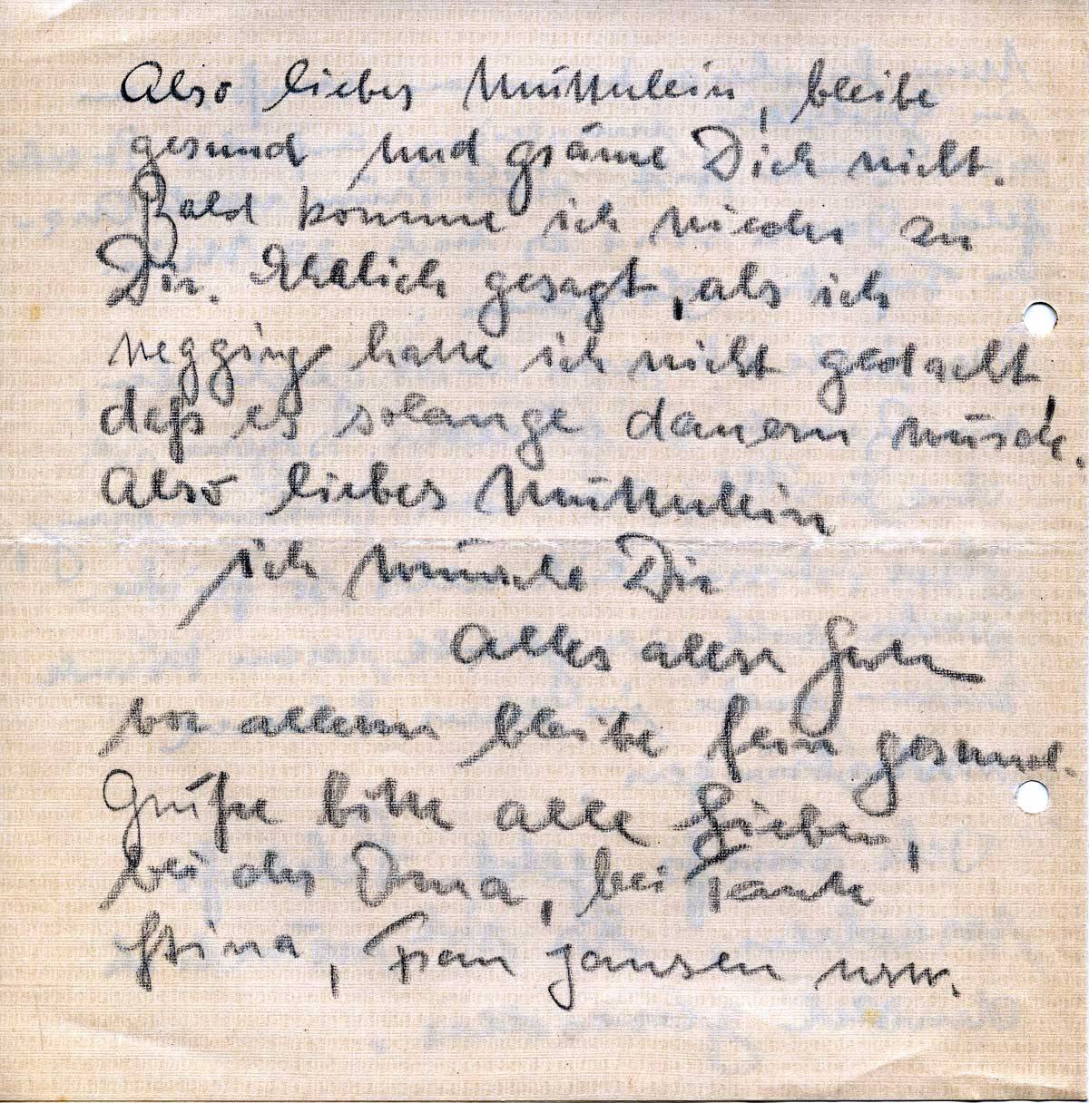 Also liebes Mütterlein, bleibe gesund und gräme Dich nicht. Bald komme ich wieder zu Dir. Ehrlich gesagt, als ich wegging hatte ich nicht gedacht, daß es solange dauern würde. Also liebes Mütterlein