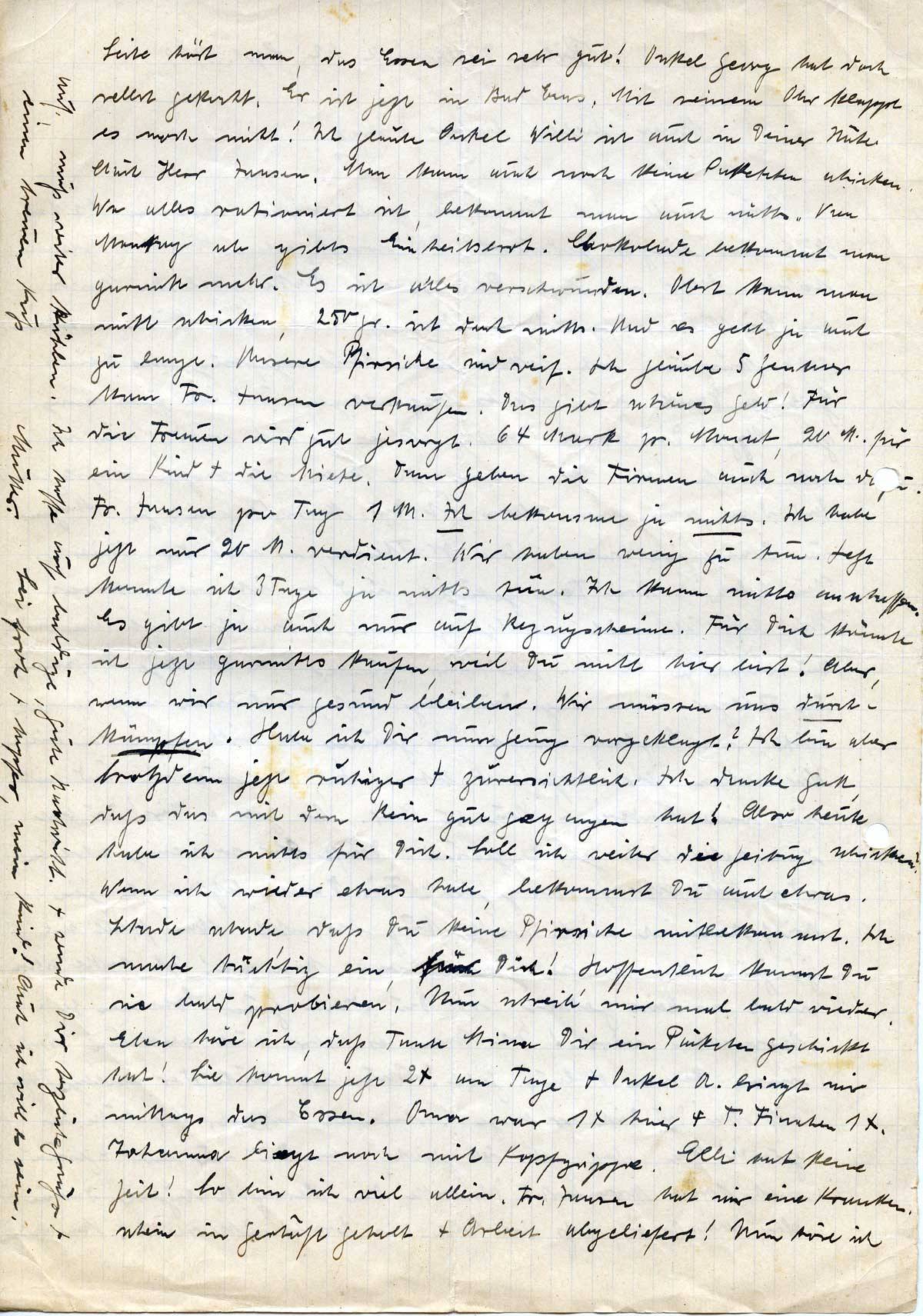 Seite hört man, das Essen sei sehr gut! Onkel Georg hat doch selbst gekocht. Er ist jetzt in Bad Ems. Mit seinem Ohr klappt es noch nicht! Ich glaube Onkel Willi ist auch in Deine Nähe. Auch Herr Jansen. Man kann euch noch keine Paketchen schicken. Wo alles rationiert ist, bekommt man auch nichts. Von Montag ab gibts Einheitsbrot. Chokolade bekommt man garnicht mehr. Es ist alles verschwunden. Obst kann man nicht schicken, 250 gr. ist doch nichts. Und es geht ja auch zu lange. Unsere Pfirsiche sind reif. Ich glaube 5 Zentner kann Fr. Jansen verkaufen. Das gibt schönes Geld! Für die Frauen wird gut gesorgt. 64 Mark pr. Monat, 20 M. für ein Kind + die Miete. Dann geben die Firmen auch noch dazu. Fr. Jansen pro Tag 1 M. Ich bekomme ja nichts. Ich habe jetzt nur 20 M. verdient. Wir haben wenig zu tun. Jetzt konnte ich 3 Tage ja nichts tun. Ich kann nichts anschaffen. Es gibt ja auch nur auf Bezugscheine. Für Dich könnte ich jetzt garnichts kaufen, weil Du nicht hier bist! Aber, wenn wir nur gesund bleiben. Wir müssen uns durchkämpfen. Habe ich Dir nun genug vorgeklagt? Ich bin aber trotzdem jetzt ruhiger + zuversichtlich. Ich danke Gott, daß das mit dem Knie gut gegangen hat! Also heute habe ich nichts für Dich. Soll ich weiter die Zeitung schicken? Wenn ich wieder etwas habe, bekommst Du auch etwas.