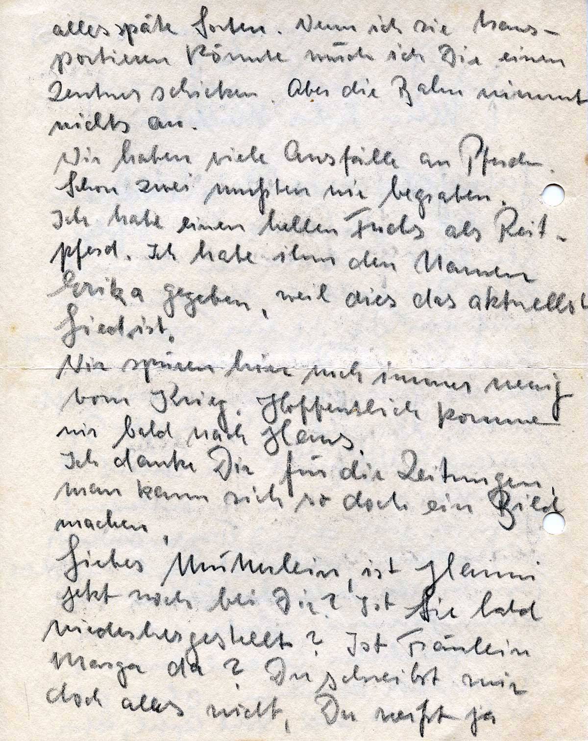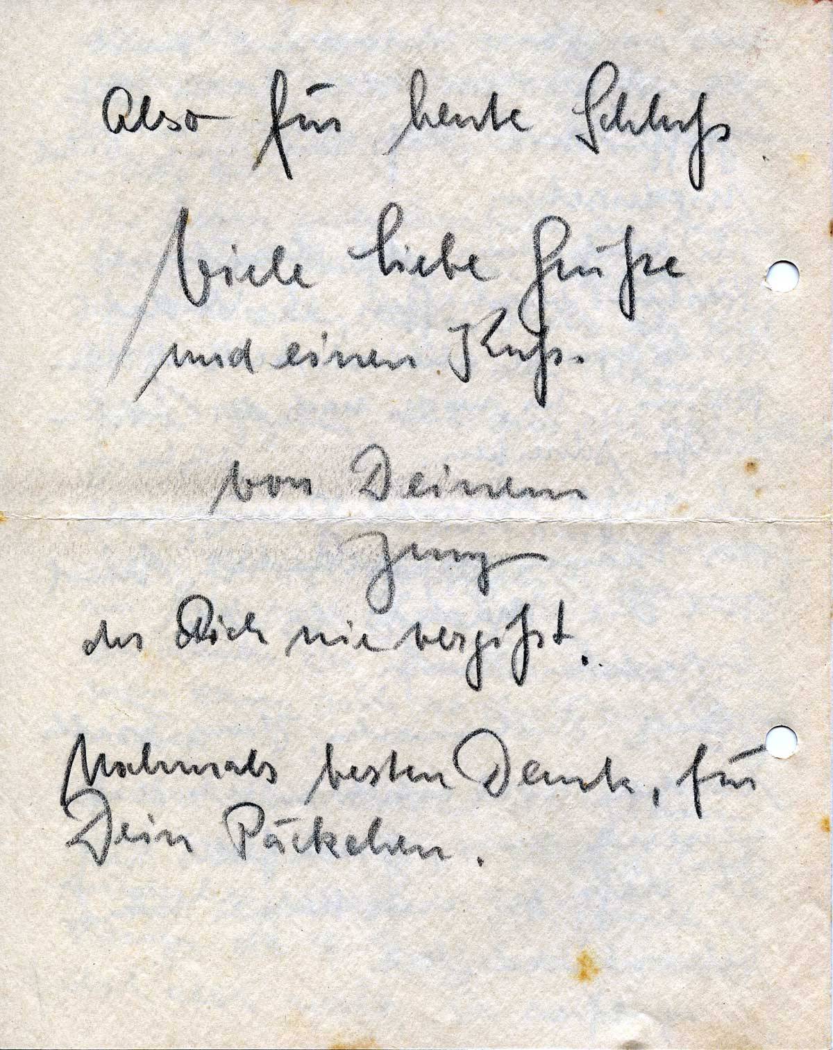 Liebes Mütterlein, ist Hanni jetzt noch bei Dir? Ist sie bald wiederhergestellt? Ist Fräulein Marga da? Du schreibst mir doch alles nicht, Du weißt ja