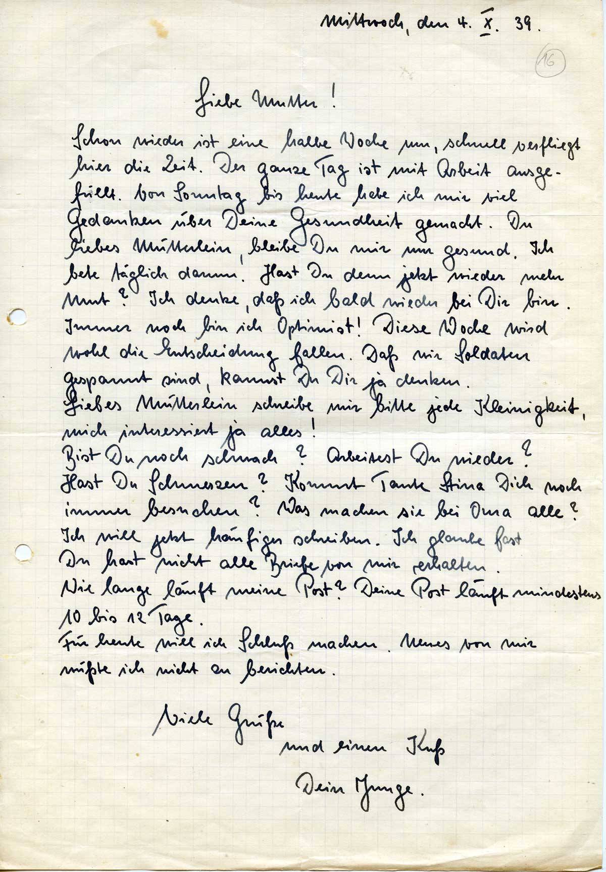 Schon wieder ist eine halbe Woche um, schnell verfliegt hier die Zeit. Der ganze Tag ist mit Arbeit ausgefüllt. Von Sonntag bis heute habe ich mir viel Gedanken über Deine Gesundheit gemacht. Du liebes Mütterlein, bleibe Du mir nur gesund. Ich bete täglich darum. Hast Du denn jetzt wieder mehr Mut? Ich denke, daß ich bald wieder bei Dir bin. Immer noch bin ich Optimist! Diese Woche wird wohl die Entscheidung fallen. Daß wir Soldaten gespannt sind, kannst Du Dir ja denken.
