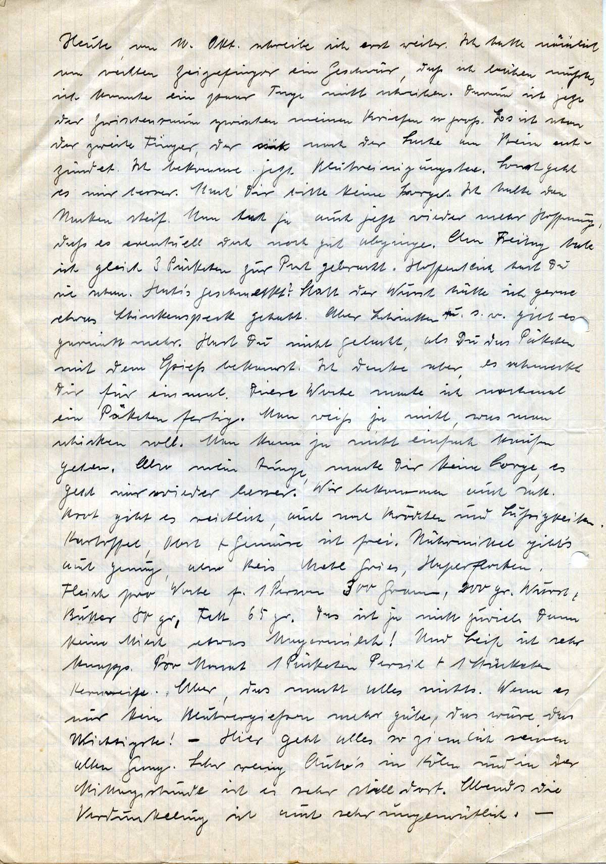 Heute, am 10. Okt. schreibe ich erst weiter. Ich hatte nämlich am rechten Zeigefinger ein Geschwür, daß ich bähen mußte, ich konnte ein paar Tage nicht schreiben. Darum ist jetzt der Zwischenraum zwischen meinen Briefen so groß. Es ist schon der zweite Finger, der sich nach der Sache am Bein entzündet. Ich bekomme jetzt Blutreinigungstee. Sonst geht es mir besser. Mach‘ Dir bitte keine Sorge. Ich halte den Nacken steif. Man hat ja auch jetzt wieder mehr Hoffnung, daß es eventuell doch noch gut abginge. Am Freitag habe ich gleich 3 Päckchen zur Post gebracht. Hoffentlich hast Du sie schon. Hat’s geschmeckt? Statt der Wurst hätte ich gerne etwas Schinkenspeck gehabt. Aber Schinken u.s.w. gibt es garnicht mehr. Hast Du nicht gelacht, als Du das Päckchen mit dem Grieß bekamst. Ich denke aber, es schmeckt Dir für einmal. Diese Woche mache ich nochmal ein Päckchen fertig. Man weiß ja nicht, was man schicken soll. Man kann ja nicht einfach kaufen gehen. Aber mein Junge, mache Dir keine Sorge, es geht mir wieder besser. Wir bekommen auch satt. Brot gibt es reichlich, auch mal Brötchen und Süßigkeiten. Kartoffel, Brot + Gemüse ist frei. Nährmittel gibt’s auch genug, also Reis, Mehl, Gries, Haferflocken. Fleisch pro Woche f. 1 Person 300 Gramm, 200 gr. Wurst, Butter 80 gr., Fett 65 gr. Das ist ja nicht zuviel. Dann keine Milch, etwas Magermilch! Und Seife ist sehr knapp. Pro Monat 1 Päckchen Persil + 1 Stückchen Kernseife. Aber, das macht alles nichts. Wenn es nur kein Blutvergießen mehr gäbe, das wäre das Wichtigste! – Hier geht alles so ziemlich seinen alten Gang. Sehr wenig Auto’s in Köln und in der Mittagsstunde ist es sehr still dort. Abends die Verdunkelung ist auch sehr ungemütlich. –