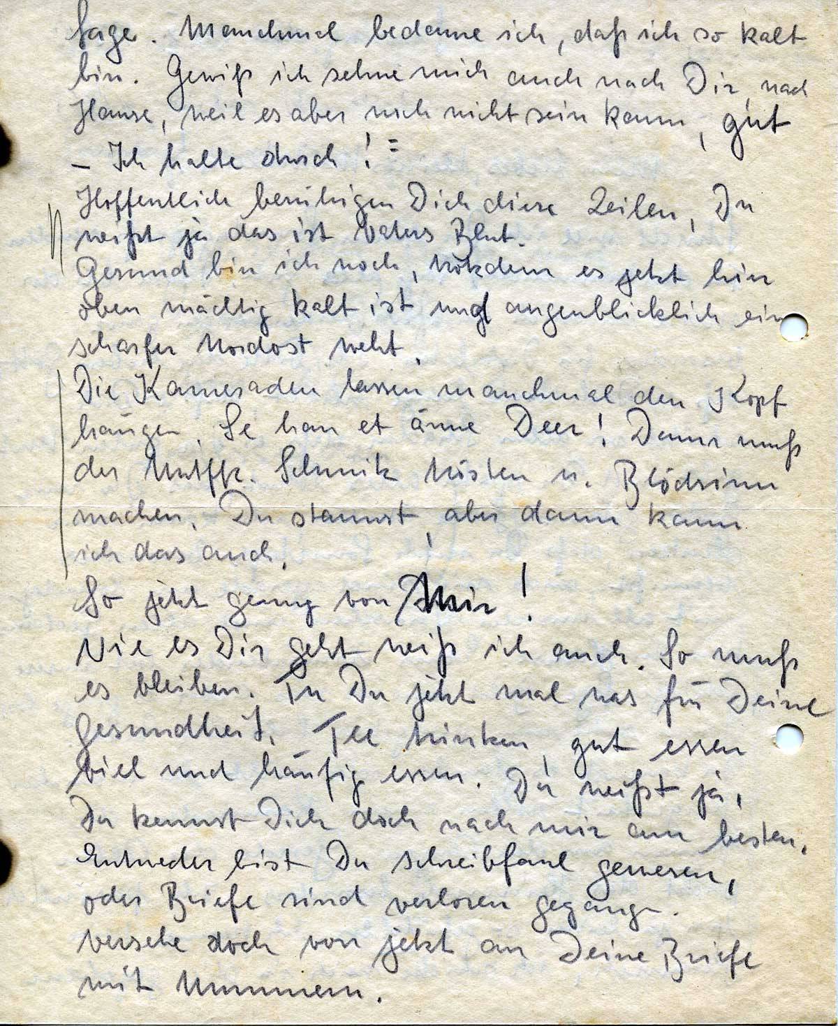 Lage. Manchmal bedauere ich, daß ich so kalt bin. Gewiß ich sehne mich auch nach Dir, nach Hause, weil es aber noch nicht sein kann, gut – Ich halte durch! –