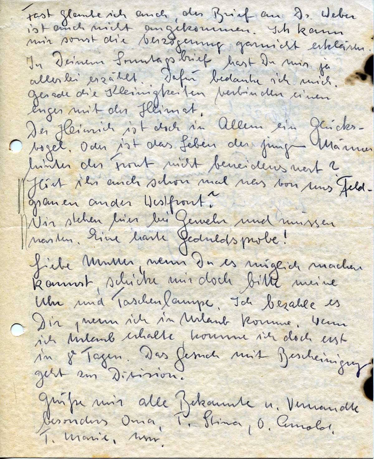 Liebe Mutter, wenn Du es möglich machen kannst, schicke mir doch bitte meine Uhr und Taschenlampe. Ich bezahle es Dir, wenn ich in Urlaub komme. Wenn ich Urlaub erhalte, komme ich doch erst in 8 Tagen. Das Gesuch mit Bescheinigung geht zur Division.