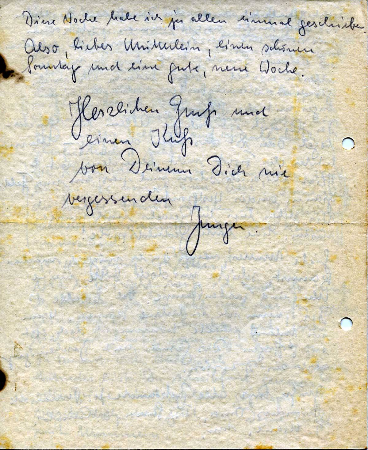 Schnell will ich Dir einen Sonntagsgruß senden! Für den kommenden Tag alles Gute. Denke bei der Messe an mich, auch ich werde morgen ganz besonders für Dich beten. Ich bitten den lieben Gott, daß er Dich mir lange erhält, daß er Dich schützt vor allen Schäden, daß er Dir guten Mut gibt und Dir später alles lohnt, was Du mir Gutes getan. Liebe Mutter, ich kann mir denken, daß Du mich Sonntags besonders vermißt, auch wir sind gerade am Sonntag mit all unseren Wünschen und allen Gedanken zu Hause. Etwas Zermürbendes hat unsere jetzige Lage. Bald wäre es uns lieber es ginge los. Dann sähe man wenigstens bald ein Ende.
