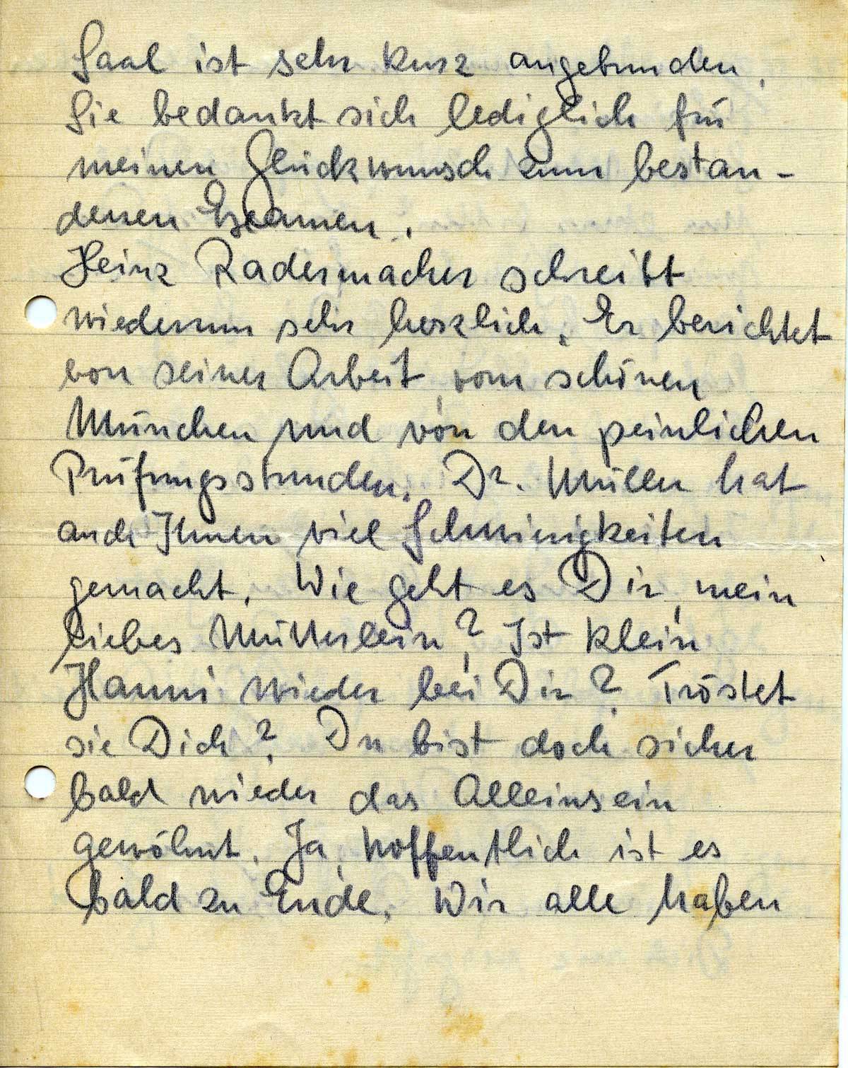 Heinz Radermacher schreibt wiederum sehr herzlich. Er berichtet von seiner Arbeit, vom schönen München und von den peinlichen Prüfungsstunden. Dr. Müller hat auch Ihnen viel Schwierigkeiten gemacht. Wie geht es Dir, mein liebes Mütterlein? Ist klein Hanni wieder bei Dir? Tröstet sie Dich? Du bist doch sicher bald wieder das Alleinsein gewöhnt. Ja, hoffentlich ist es bald zu Ende. Wir alle haben