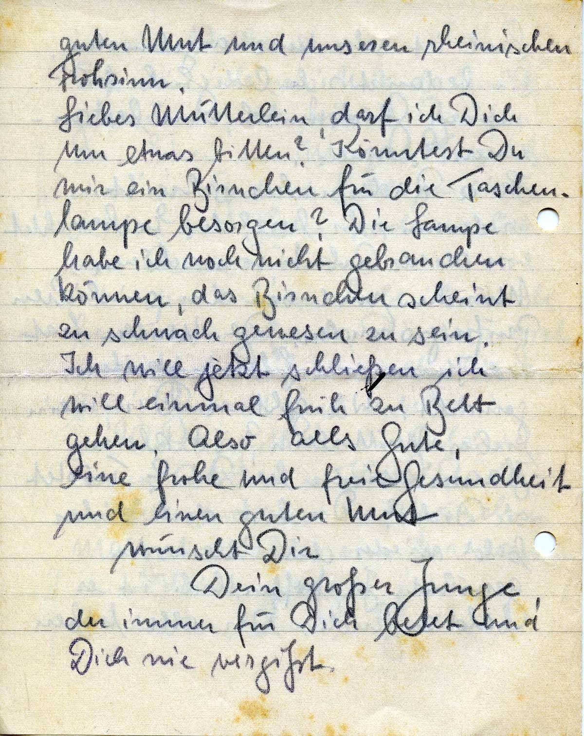 Liebes Mütterlein, darf ich Dich um etwas bitten? Könntest Du mir ein Birnchen für die Taschenlampe besorgen? Die Lampe habe ich noch nicht gebrauchen können, das Birnchen scheint zu schwach gewesen zu sein.
