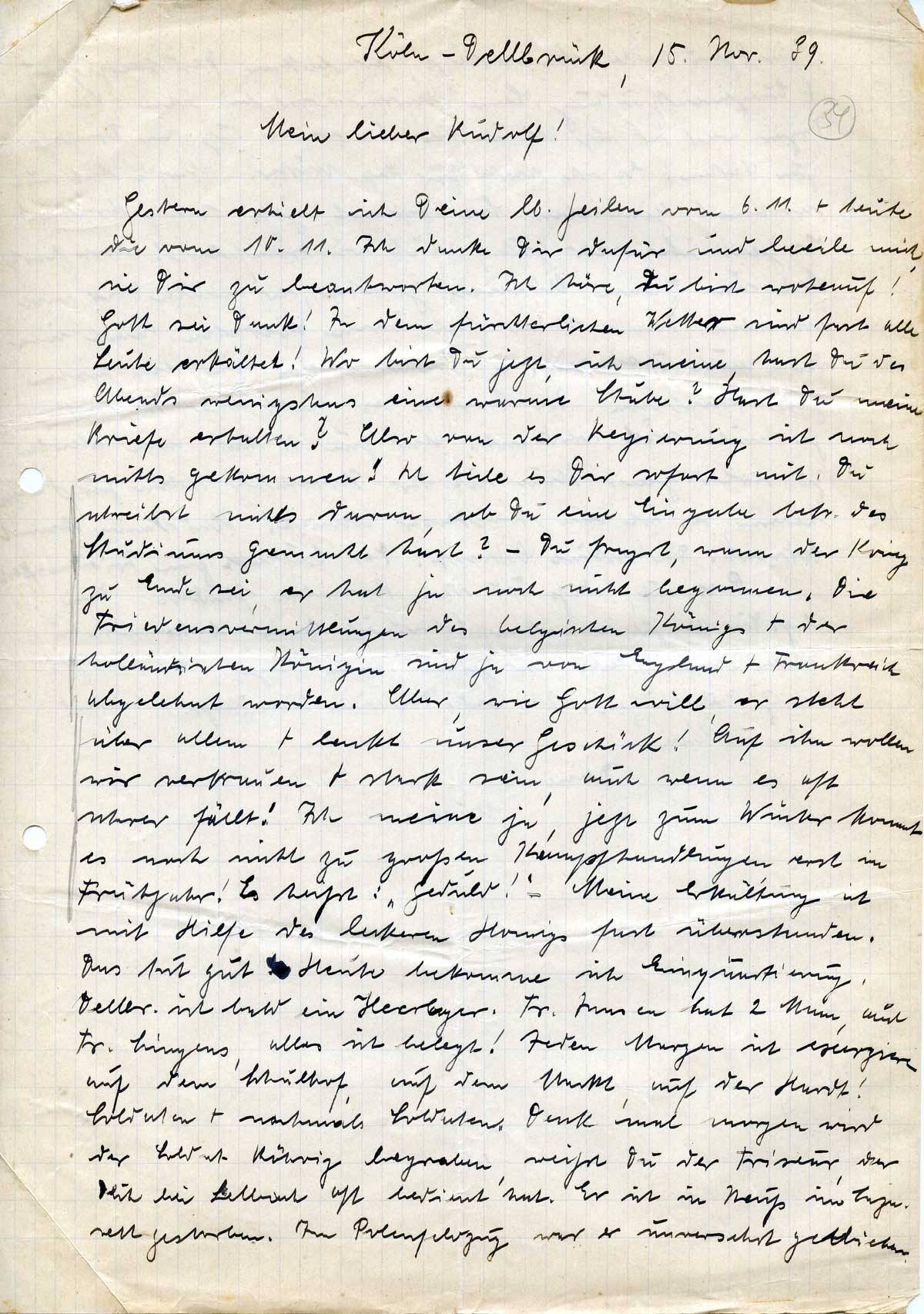 Gestern erhielt ich Deine lb. Zeilen vom 6.11. + heute die vom 10.11. Ich danke Dir dafür und beeile mich, sie Dir zu beantworten. Ich höre, Du bist wohlauf! Gott sei Dank! In dem fürchterlichen Wetter sind fast alle Leute erkältet! Wo bist Du jetzt, ich meine, hast Du des Abends wenigstens eine warme Stube? Hast Du meine Briefe erhalten? Also von der Regierung ist noch nichts gekommen! Ich teile es Dir sofort mit. Du schreibst nichts davon, ob Du eine Eingabe betr. des Studiums gemacht hast? – Du fragst, wann der Krieg zu Ende ist, er hat ja noch nicht begonnen. Die Friedensvermittlungen des belgischen Königs + der holländischen Königin sind ja von England + Frankreich abgelehnt worden. Aber, wie Gott will, er steht über allem + lenkt unser Geschick! Auf ihn wollen wir vertrauen + stark sein, auch wenn es oft schwer fällt! Ich meine ja, jetzt zum Winter kommt es noch nicht zu großen Kampfhandlungen, erst im Frühjahr! Es heißt: „Geduld!“ – Meine Erkältung ist mit Hilfe des leckeren Honigs fast überstanden. Das tut gut. Heute bekomme ich Einquartierung. Dellbr. ist bald ein Heerlager. Fr. Jansen hat 2 Mann, und Fr. Lingens, alles ist belegt! Jeden Morgen ist exerzieren auf dem Schulhof, auf dem Markt, auf der Hardt! Soldaten + nochmals Soldaten. Denk mal morgen wird der Soldat Röhrig begraben, weißt Du der Friseur, der Dich bei Lelbruch[?] oft bedient hat. Er ist in Neuß im Lazarett gestorben. Im Polenfeldzug war er unversehrt geblieben.