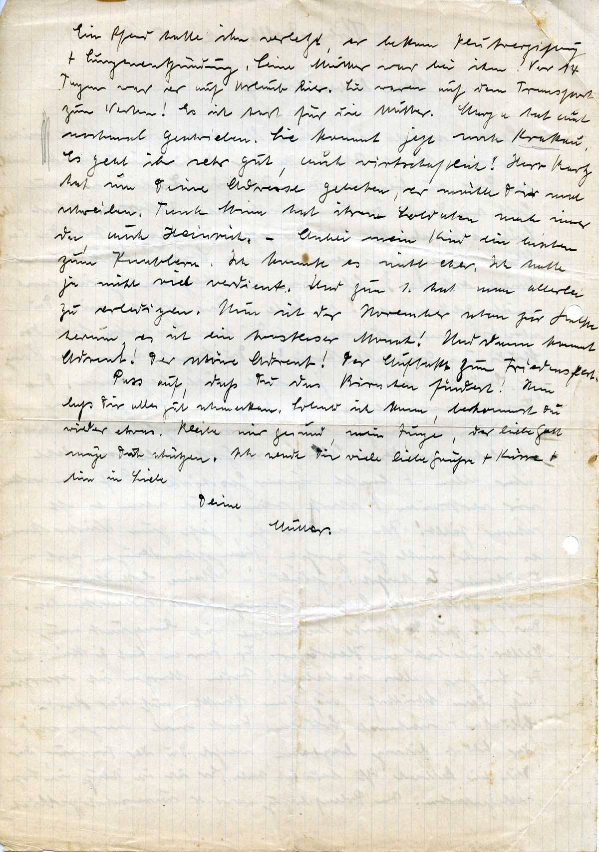 Pass auf, daß Du das Birnchen findest! Nun laß Dir alles gut schmecken. Sobald ich kann, bekommst Du wieder etwas. Bleibe mir gesund, mein Junge, der liebe Gott möge Dich schützen. Ich sende Dir viele liebe Grüße + Küsse + bin in Liebe