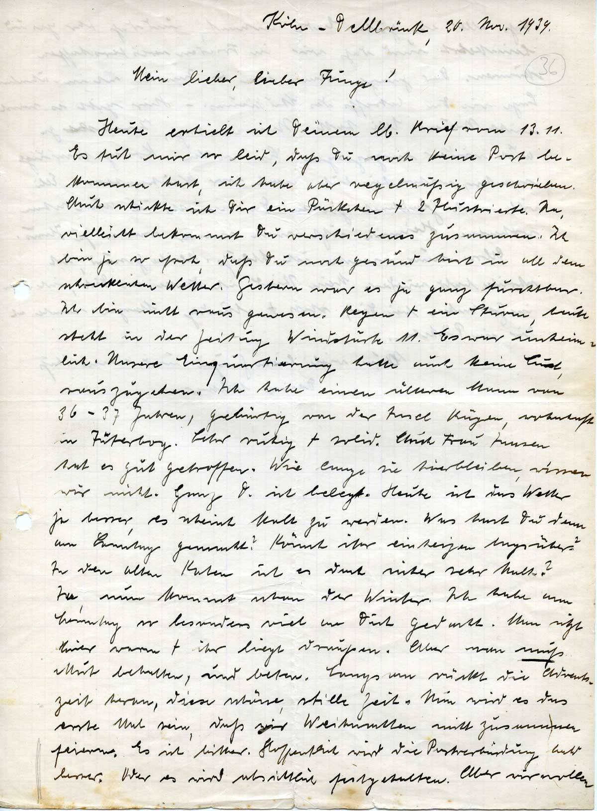 daß alles ein gutes Ende nimmt, und daß Ihr gesund heimkehrt und daß wir in Frieden weiterschaffen können. Der junge Mann von Fr. Jansen ist in ähnlicher Lage wie Du betreffs des Studiums. – Hier gibt es sonst nichts Neues. Elli hatte Namenstag, Josef ist ja auch wieder eingezogen. Sie wollen Kriegstrauung[?] machen, wahrscheinlich noch vor Weihnachten. Elli will nach Gladbach ziehen. Du möchte ich auch schon wohnen. Heinrich sitzt noch immer warm zu Haus.