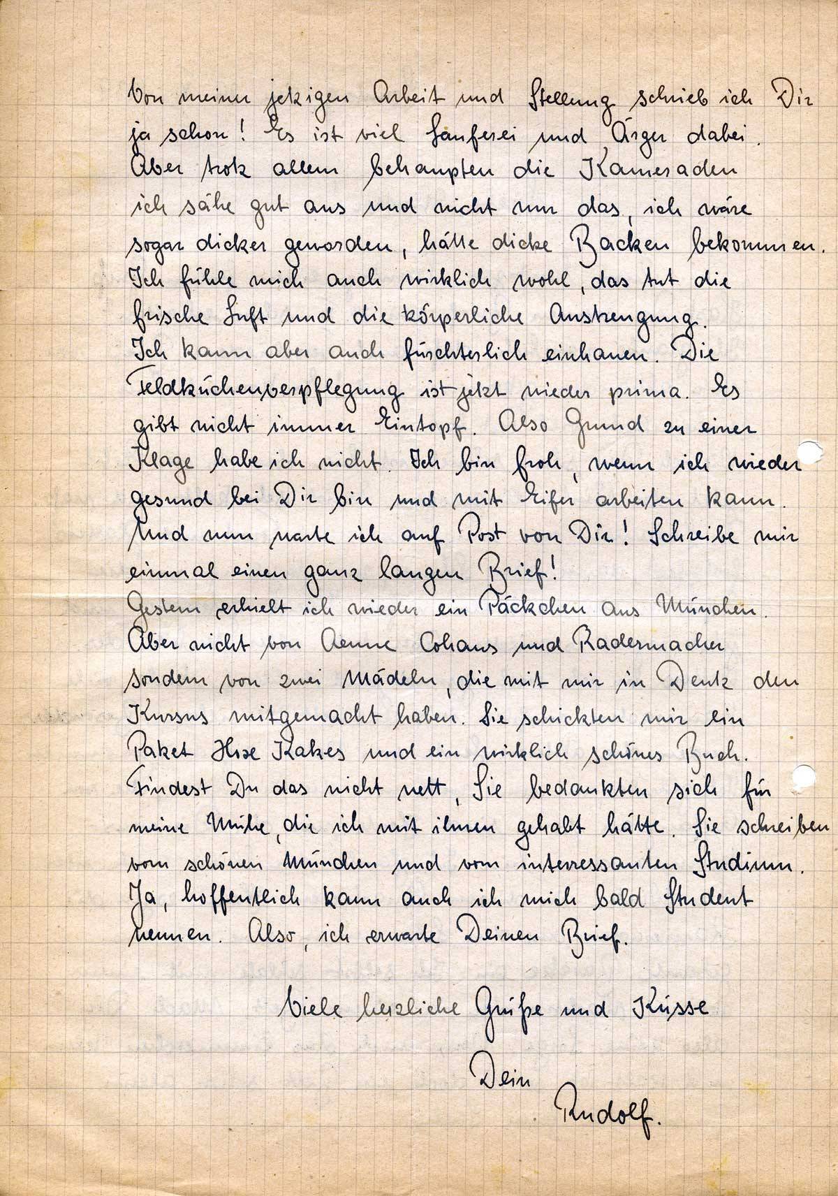 Gestern erhielt ich wieder ein Päckchen aus München. Aber nicht von Aenne Cohaus und Radermacher sondern von zwei Mädeln, die mit mir in Deutz den Kursus mitgemacht haben. Sie schickten mir ein Paket [..] Kakes und ein wirklich schönes Buch. Findest Du das nicht nett, Sie bedankten sich für meine Mühe, die ich mit ihnen gehabt hätte. Sie schreiben vom schönen München und vom interessanten Studium. Ja, hoffentlich kann auch ich mich bald Student nennen. Also, ich erwarte Deinen Brief.